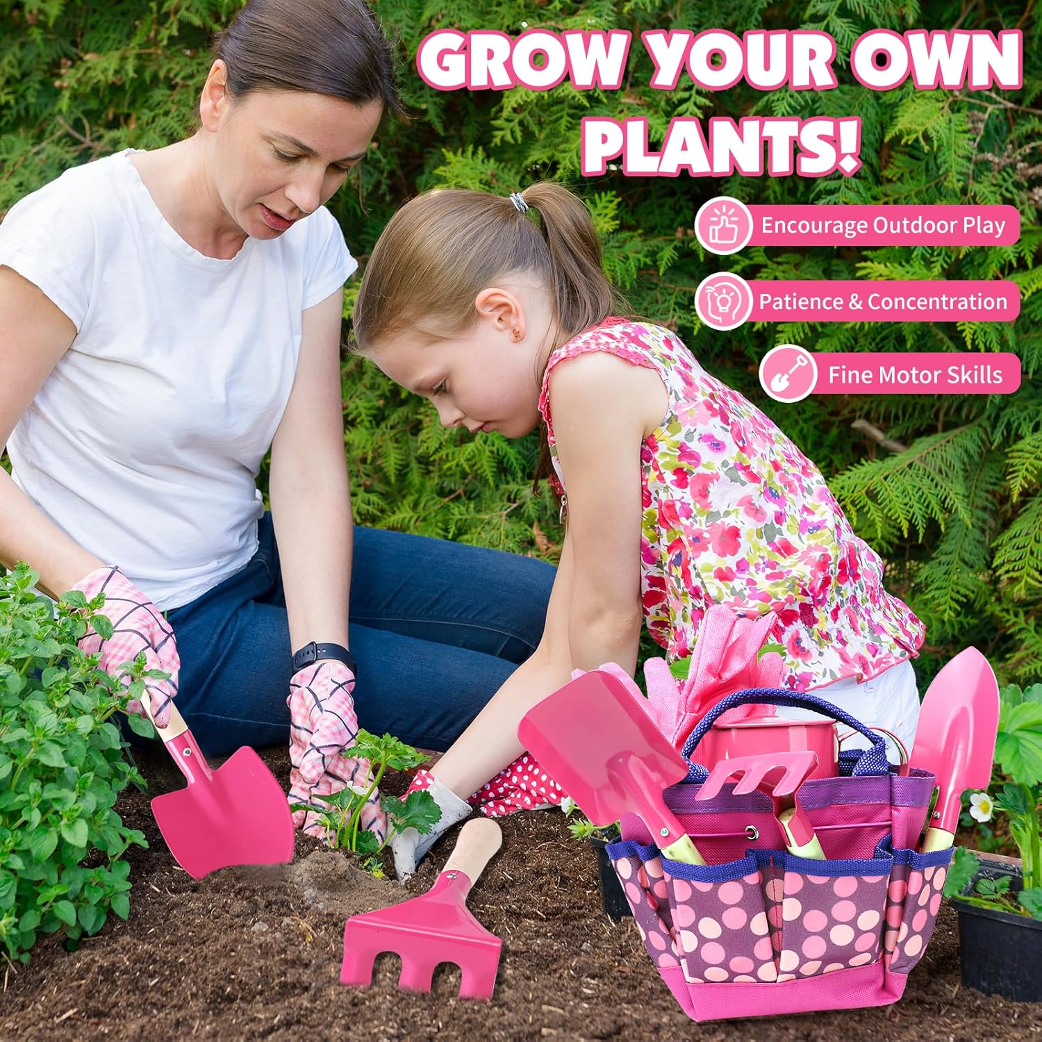Kids Gardening Tools Set, Toddler Play Kit Child Outdoor Toy with Gloves, Watering Can, Metal Shovel, Rake, Spade & Storage Bag, Backyard Sand Digging Birthday for Boys Girls 3-5 (Pink)