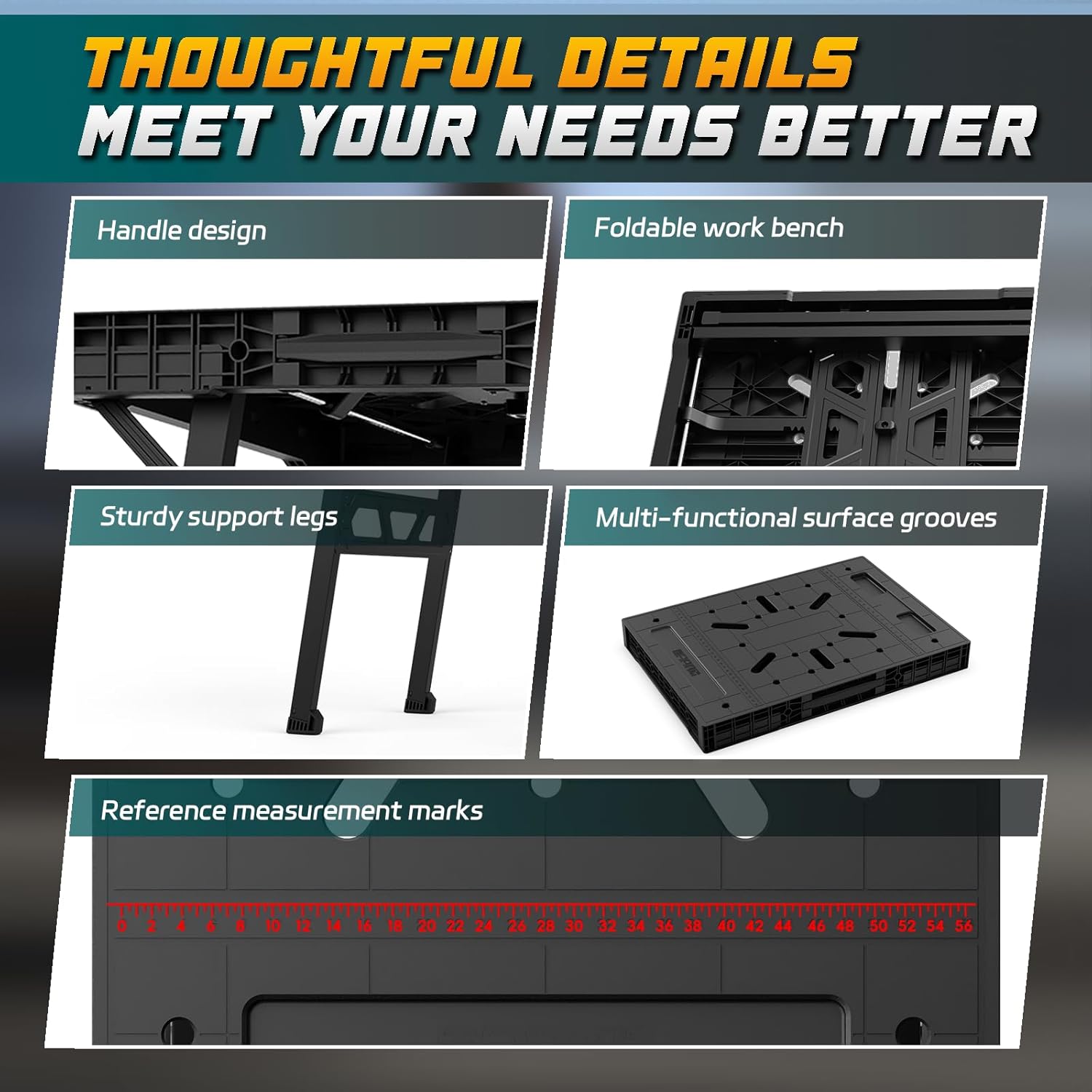 - [Foldable Design and Hadle Design]:This work bench unfolds and folds in just 3 seconds. work table have a foldable design, the folded height is only 3.7 Inches, making it a great space saver in your garage. The design with carrying handle is great for taking workbenches wherever you need to go!