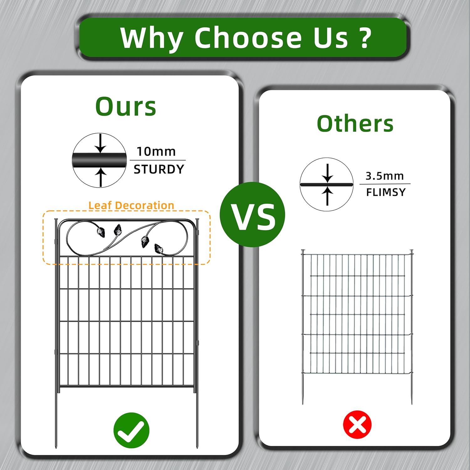- STURDY STRUCTURE: The decorative garden border fence panels made of welded by thick iron wires and thick iron tube frame, The stakes are 8mm diameter. The surface of the garden fencing with anti-rust black color powder coated outside, Which are durable and safe for decorating the yards outdoors.