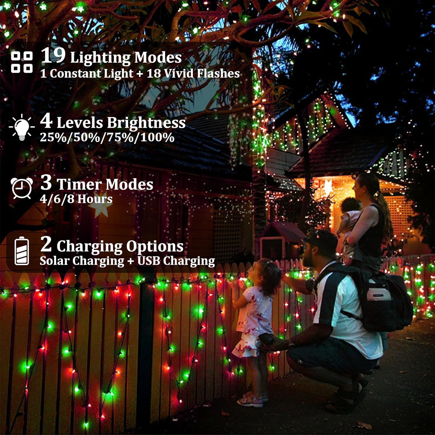 - Widely Used Solar Lights for Outdoor Christmas Decorations: This solar patio lights is a great choice for Porch, Roof, Tree, Backyard, Deck, Barbecue, Umbrella, Fence, Pergola, Bistro, Restaurant, Hotel, Commercial building, Shopping Center, Dinner, Birthday, Christmas, New Year Party and more.