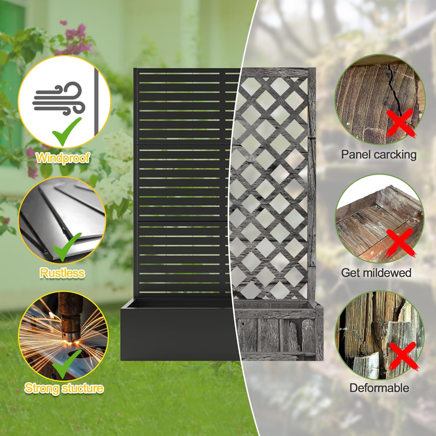 - Versatile Design: This metal planter with a trellis serves multiple purposes, making it the ideal choice for your garden. Use it as a beautiful flower stand or as an outdoor privacy screen.