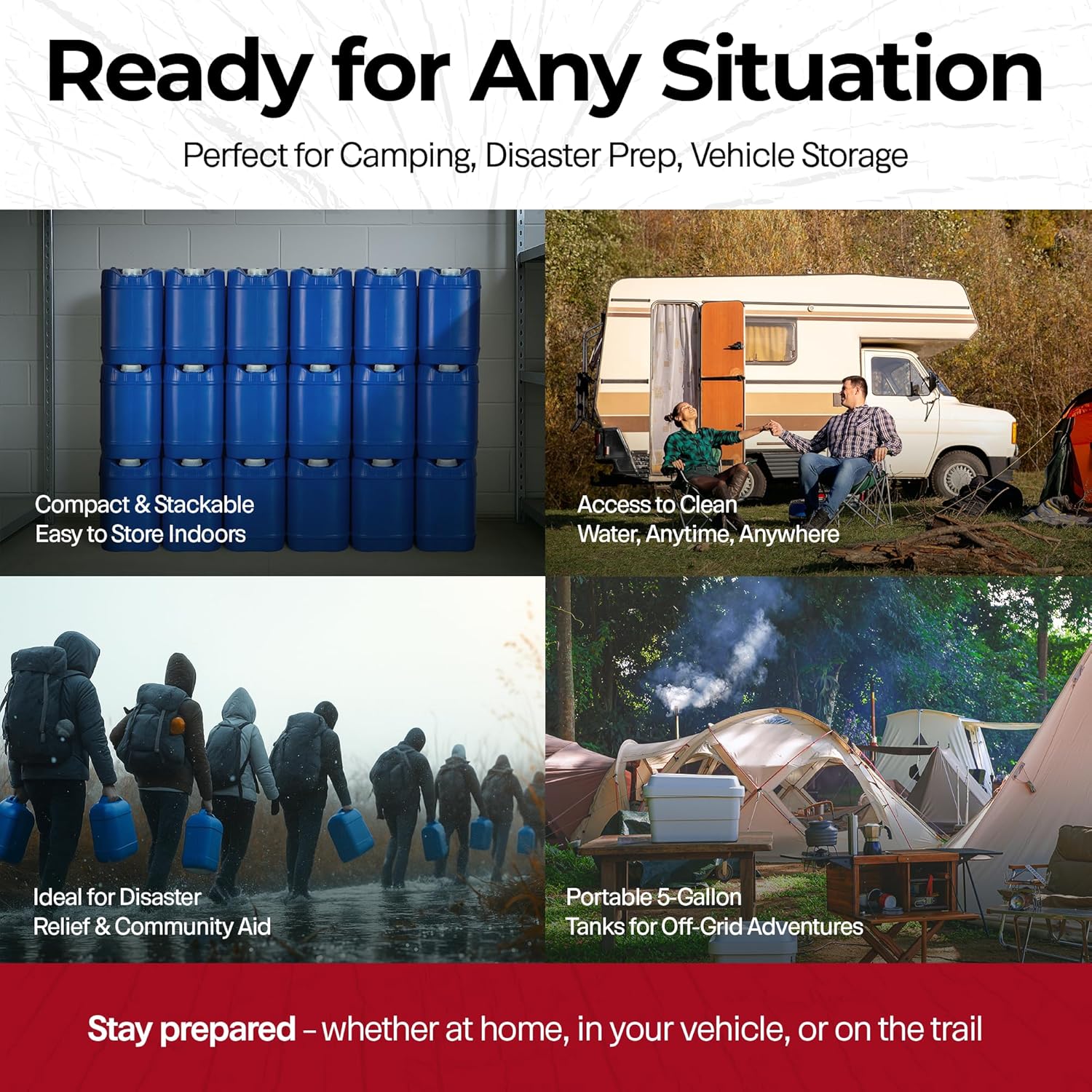 - The ideal emergency water storage system for your home. Features a built-in handle for simple transportation. Easily stackable up to 3 high for maximum space saving. An essential part of any emergency water system.
