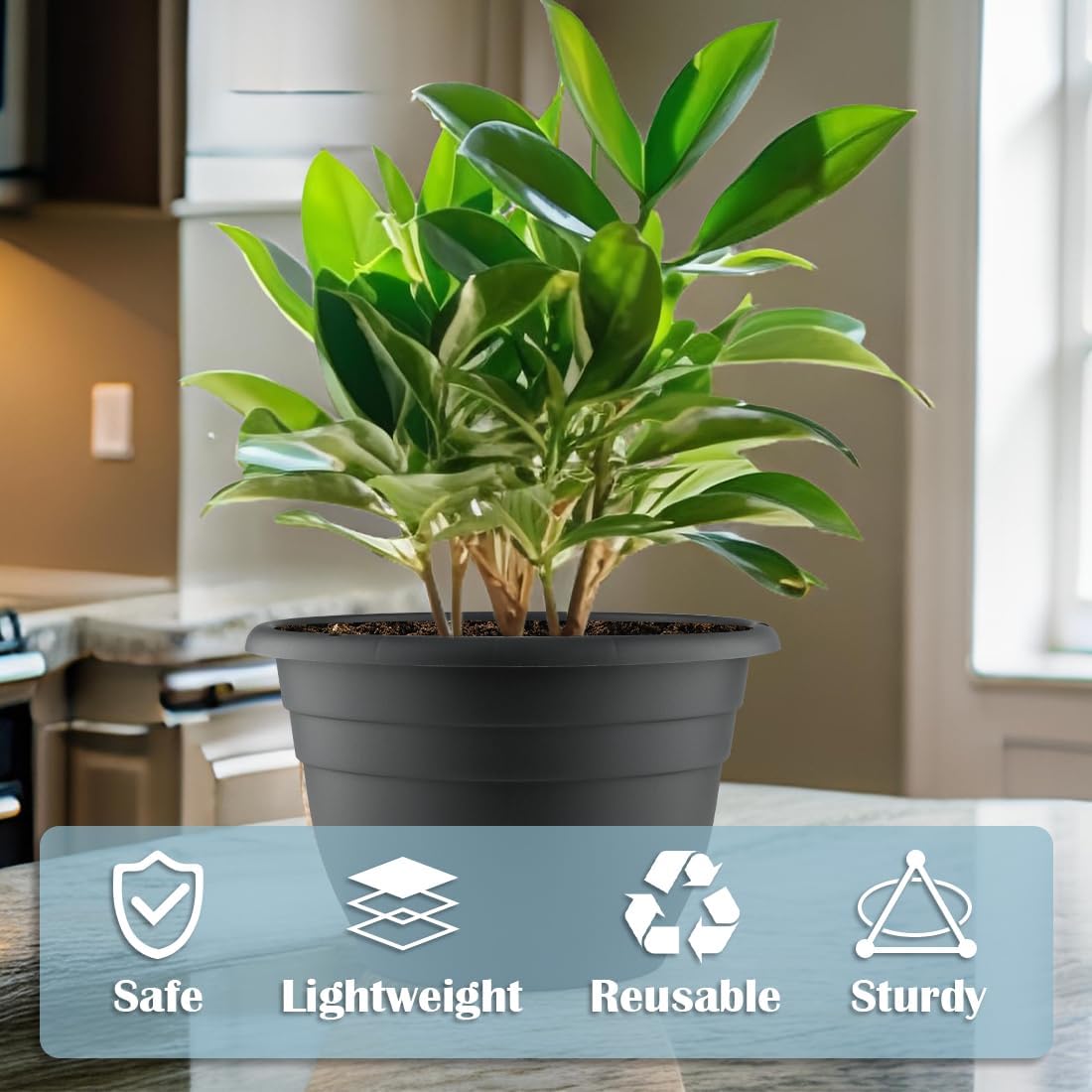 - Considering the frequently moving of the pots and the years-long repeat use, the planter pots’ edge and bottom are designed to be stronger thicker, made of premium PP material. Our pots are free from harmful BPA ingredients, guaranteeing healthy plant growth