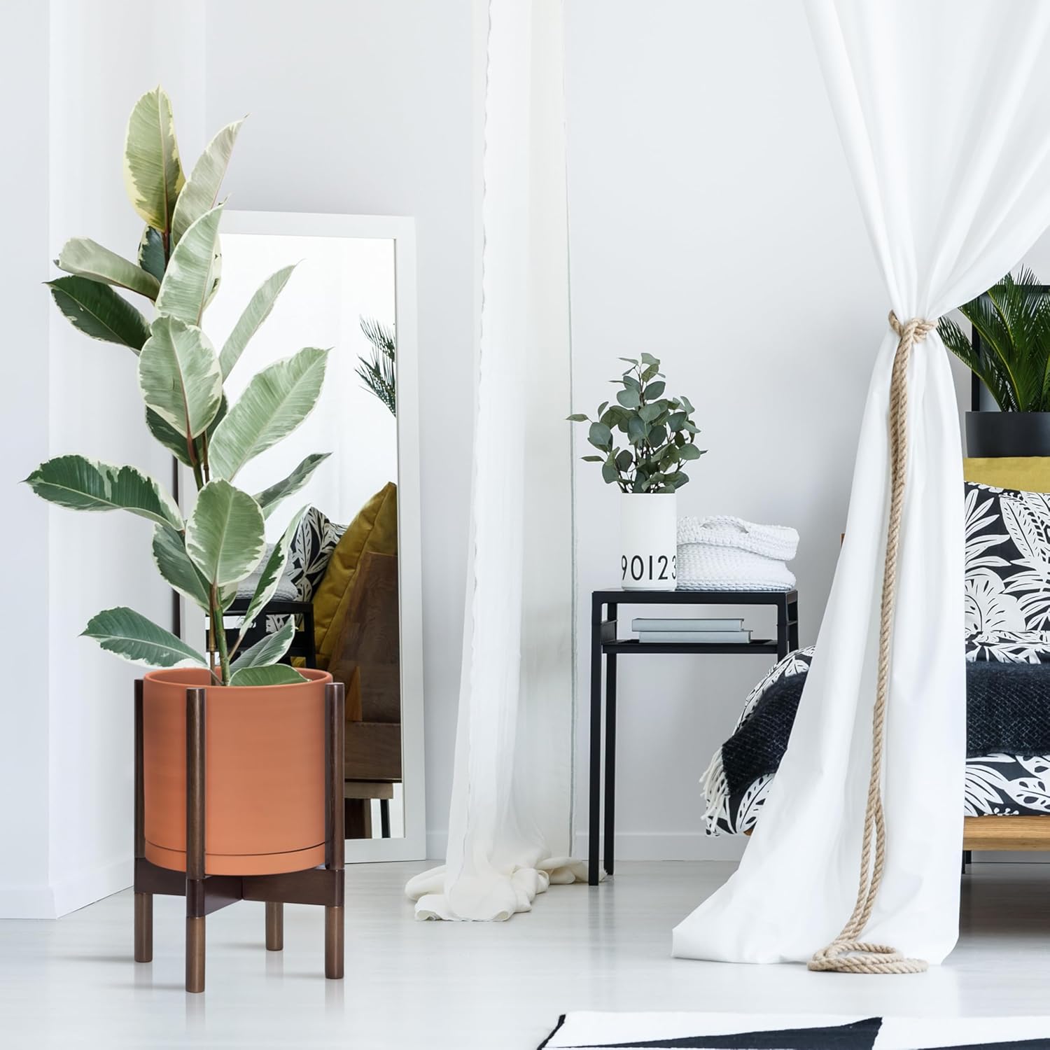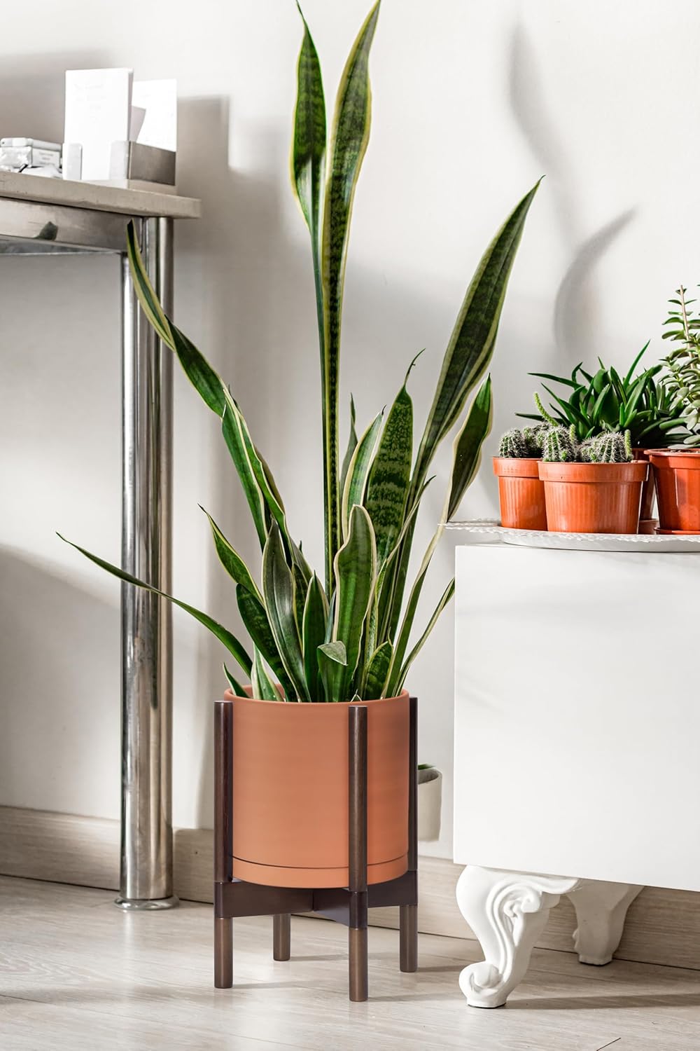 - A Complete Set: Mid-century terracotta planter, combined with a sculptural, solid wood stand that match perfectly together and looks great in anywhere.