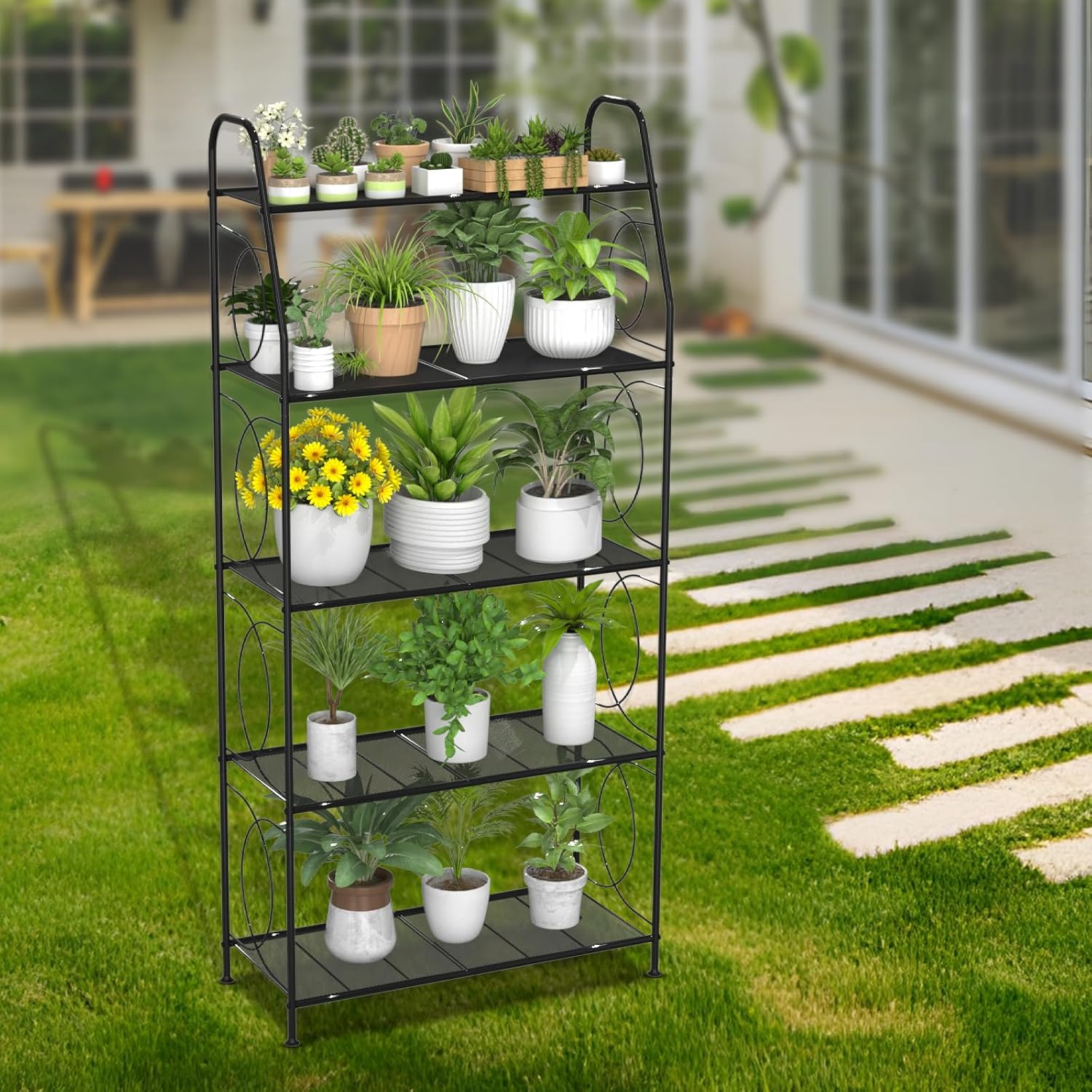 5 Tier Plant Stand Indoor Outdoor, Heavy Duty Plant Shelf, Metal Mesh Tall Plant Stands Holder Rack for Living Room Balcony and Garden, Black