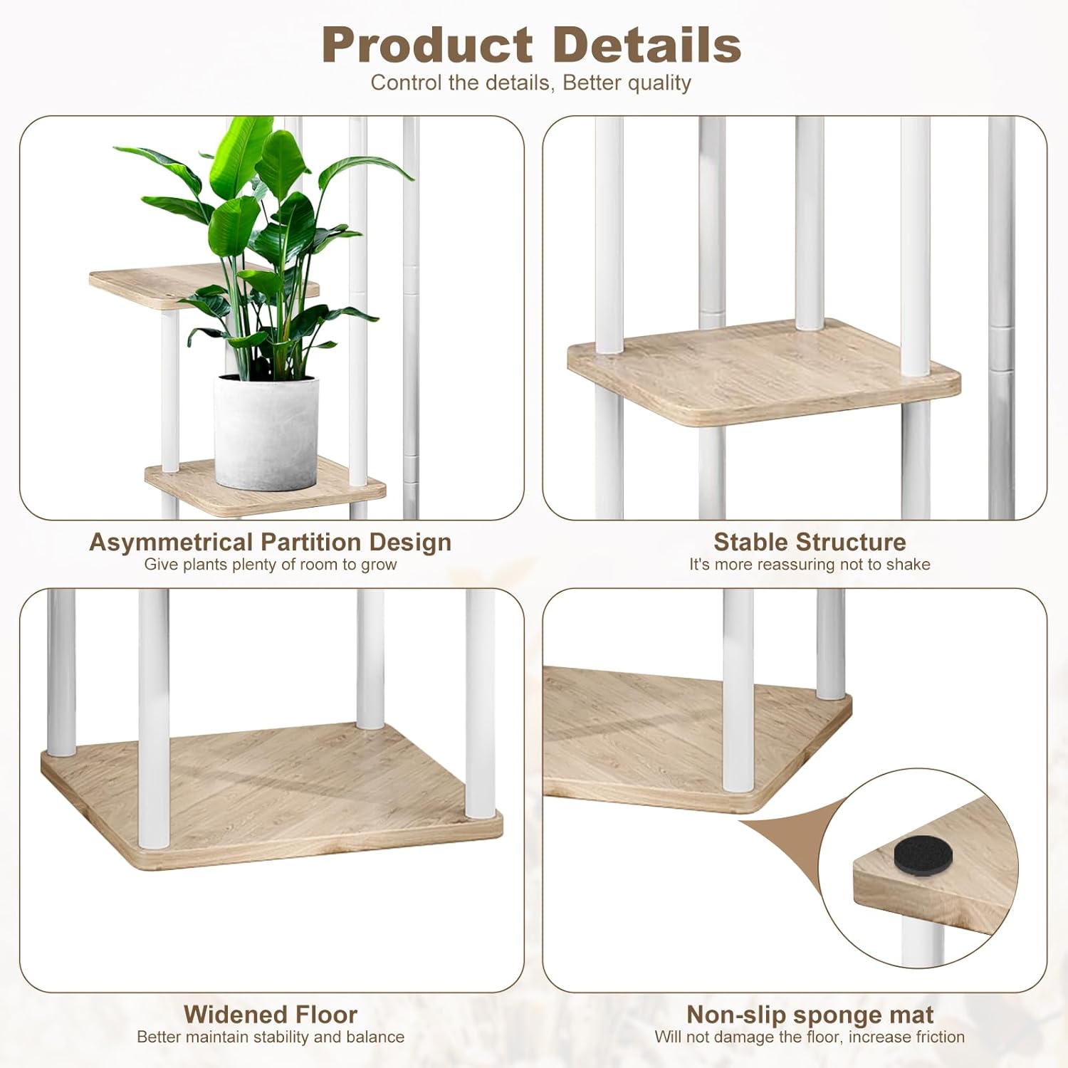 - Anti-slip Design & Easy to Install: A round foot pad at the bottom, not only prevent scratching the ground, but also adjust the balance of the plant stand. You can easily assemble this Planter Display just follow the instructions
