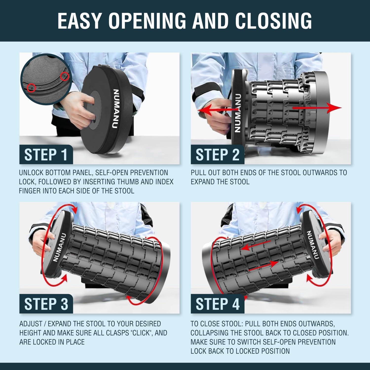 - 🔒【SELF-OPEN PREVENTION LOCK】Most Telescopic Stools cannot properly lock and many times slip out unexpectedly while Collapsed/Closed – Rest assured your NUMANU Telescoping Travel Foldable Chair is always securely locked in place with our open-prevention Safety Lock.