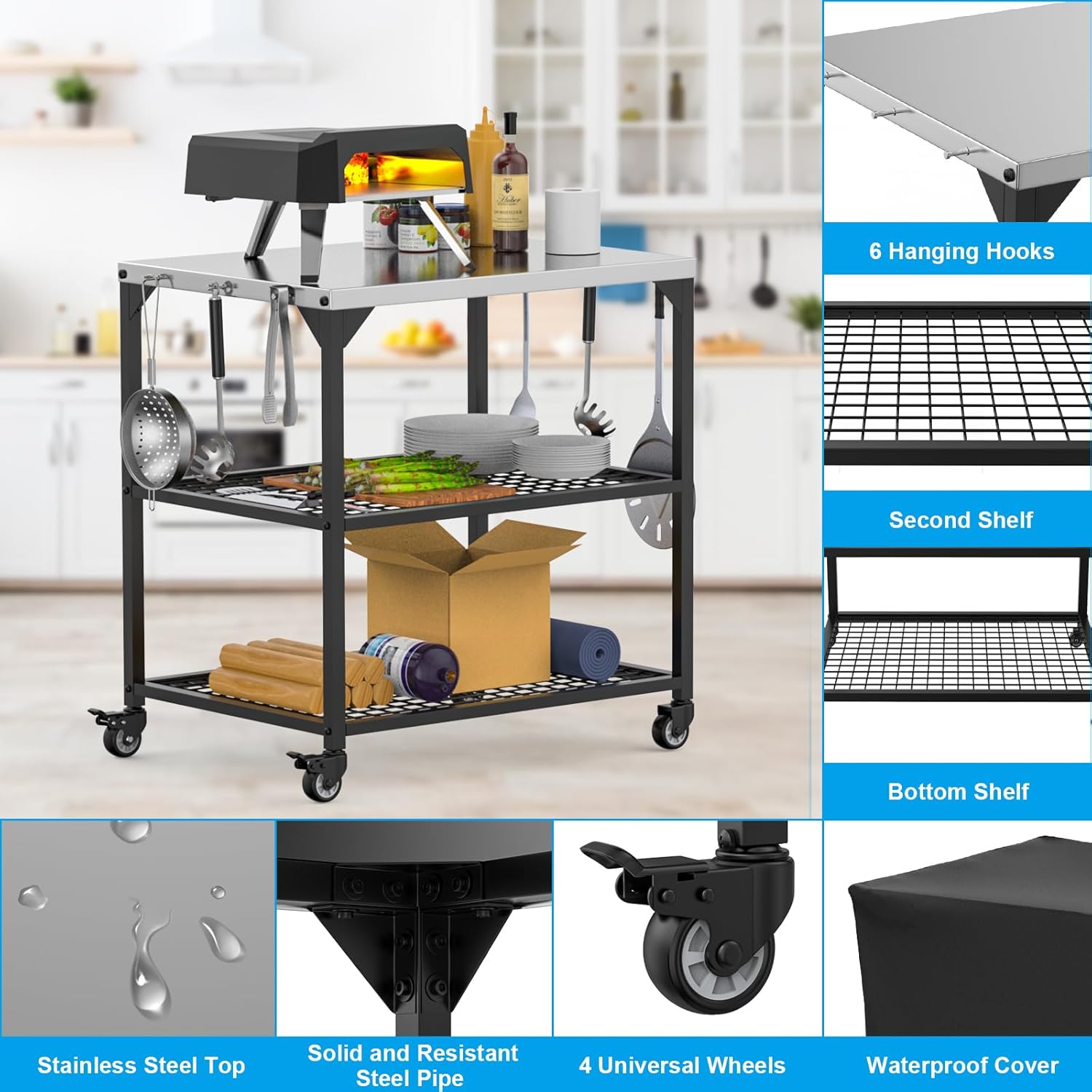 LS'BABQ Pizza Oven Table Cart for Ooni, Ninja Woodfire, Blackstone Grill Stand, Outdoor Grill Cart with Wheels, Stainless Steel Rolling Trolley Kitchen Cooking Food Prep and Work Cart Table with Cover