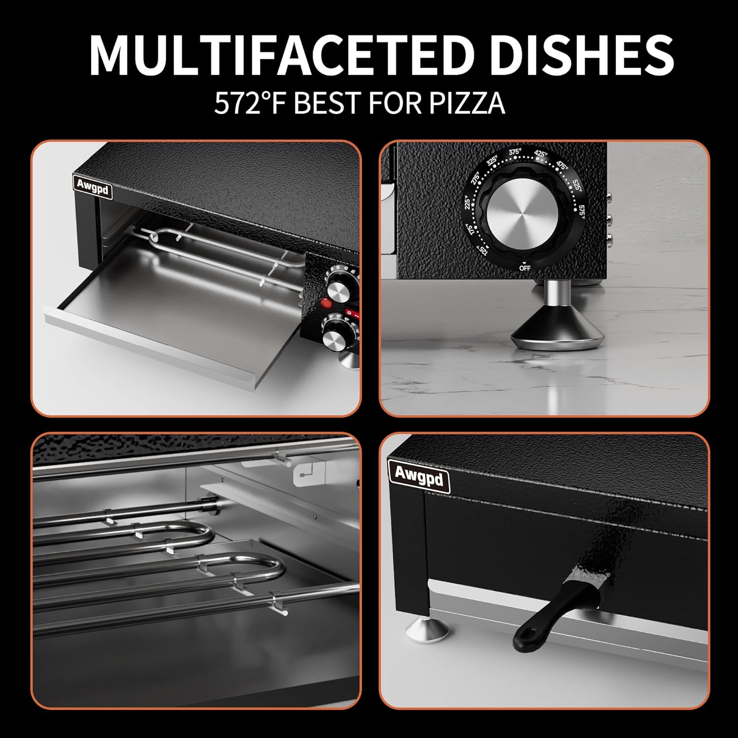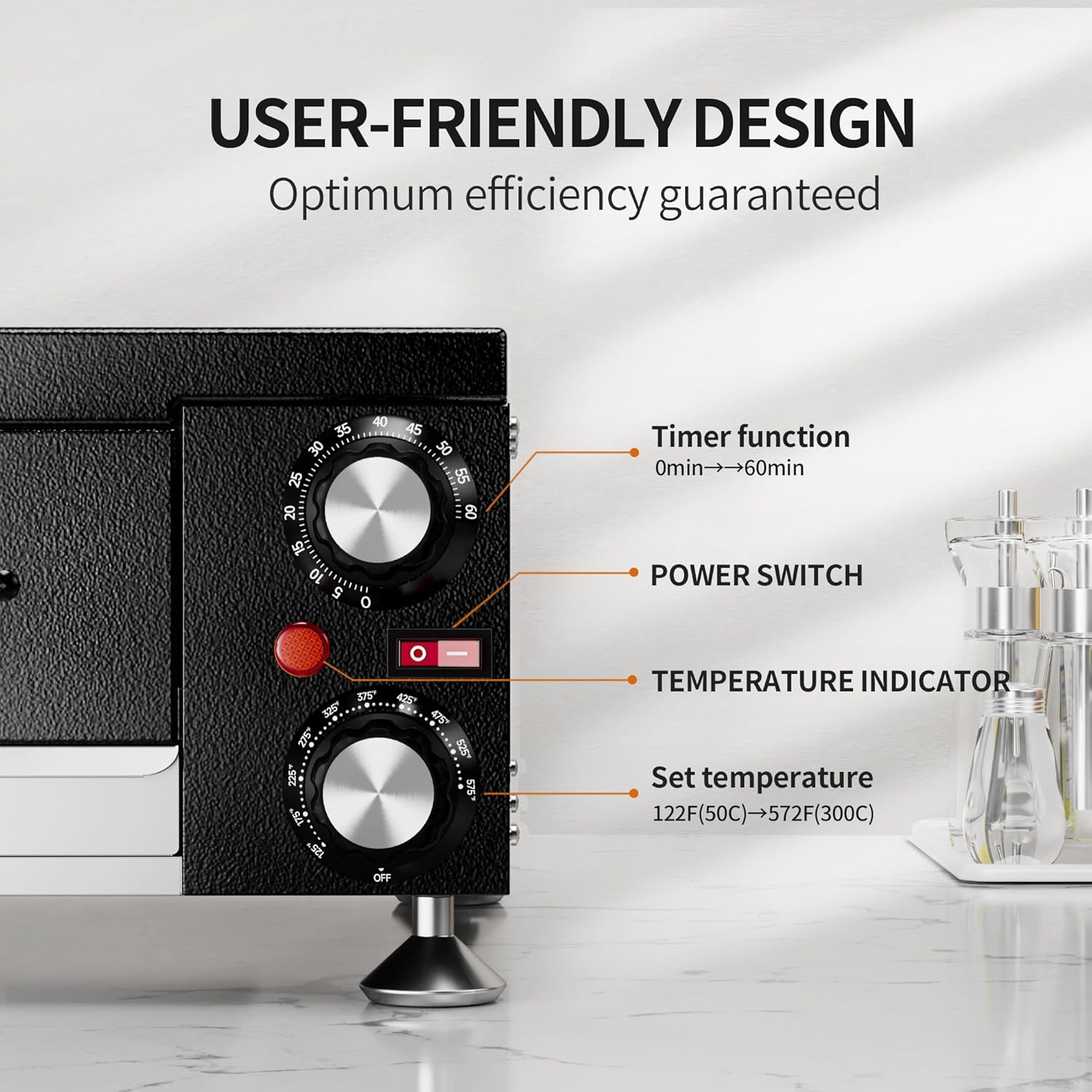 - Safety and Stability Features: The handles, crumb tray, and grilling rack of the commercial pizza oven feature insulated designs to protect your hands during use. Additionally, the oven includes anti-skid feet for stable placement, making it suitable for both home and commercial use