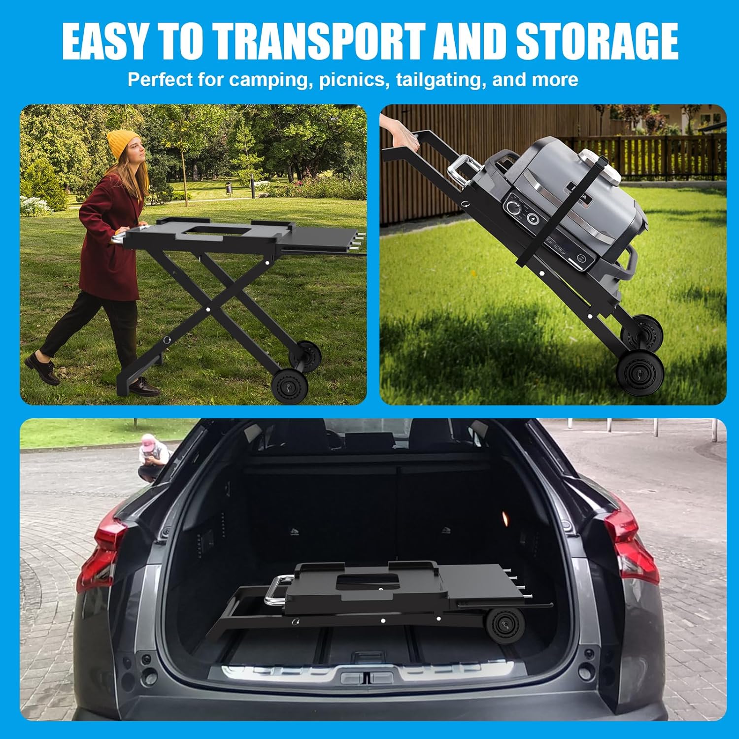 - COLLAPSIBLE DESIGN-The folding legs of our outdoor grill cart enable easy storage and transportation. It can be easily carried and stored in your car, garage, or RV. Perfect for camping, picnics, tailgating, and more