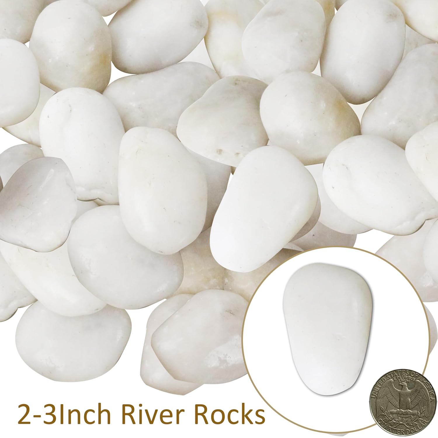 - 【40 LBS WHITE PEBBLES】- The diameter of each white river rock is approximately 2-3 inches. Composed of natural river rocks, the material will undergoes screening and extensive polishing to achieve rounded edges and corners. Following cleaning and waxing processes, it will be picked by the professional person to to remove the damaged defects, thereby ensuring the delivery of optimal products to consumers.