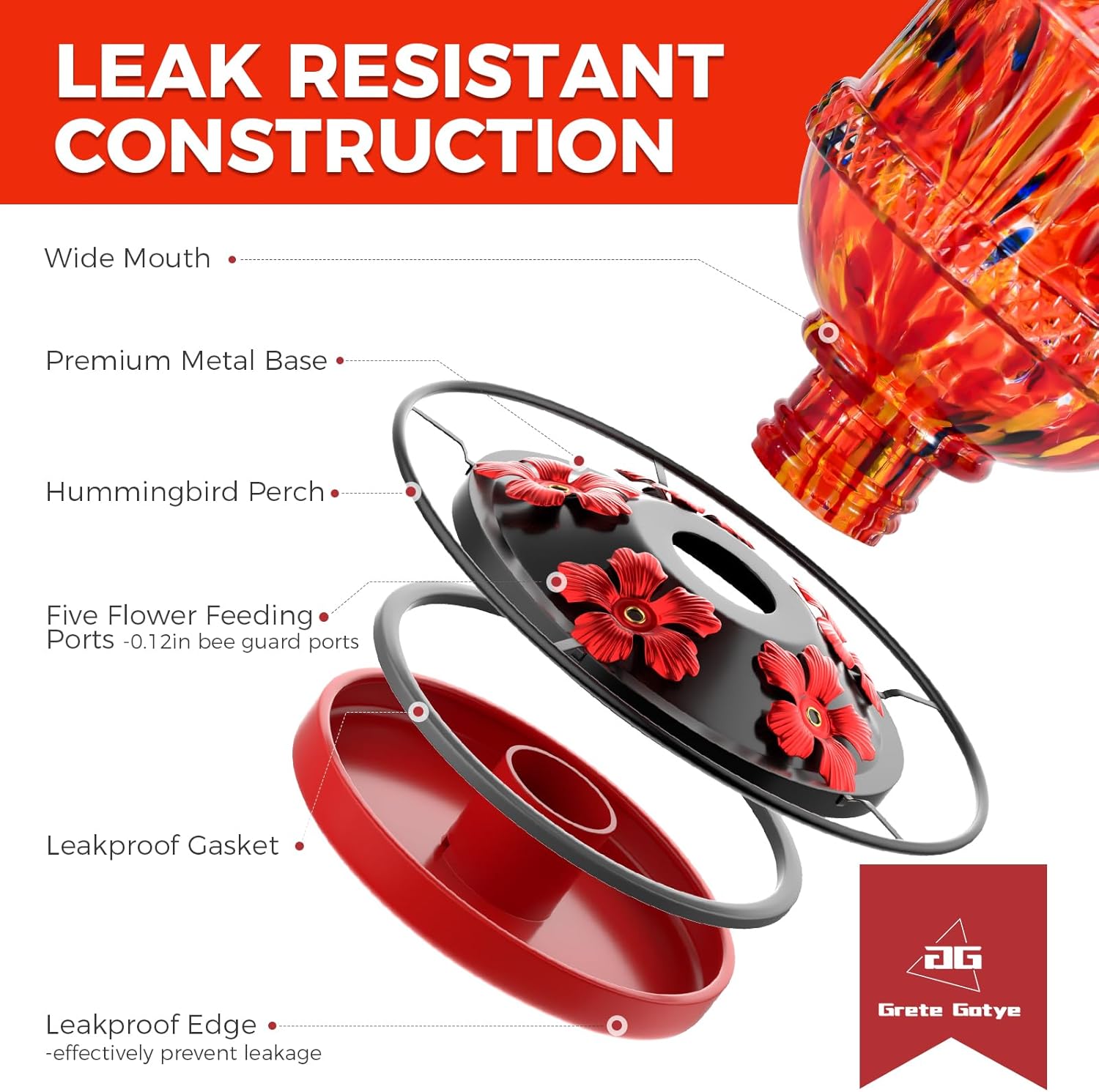 - 🐦️ATTRACT HUMMINGBIRDS: These hummingbirds feeders for outside design with vibrant colors and intricate details, made of a high-quality nectar glass container in a nice matrix shape, ensuring longevity and durability compared to plastic counterparts. Ensuring long-lasting use in outdoor conditions throughout the year and never fading. 5 flower-shaped feeding ports, 25 oz capacity with 5 feeding stations, and perch in a circle to accommodate multiple hummingbirds.