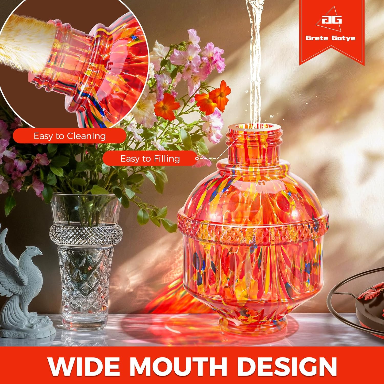 - 🪽EASY TO REFILL AND CLEAN: The super wide-mouth bottle design is easy to fill and clean, The whole glass hummingbird feeder could be disassembled smoothly for easy cleaning. With a clear bottle, you can easily monitor the hummingbird nectar level and refill it promptly, ensuring a steady supply for your feathered friends.