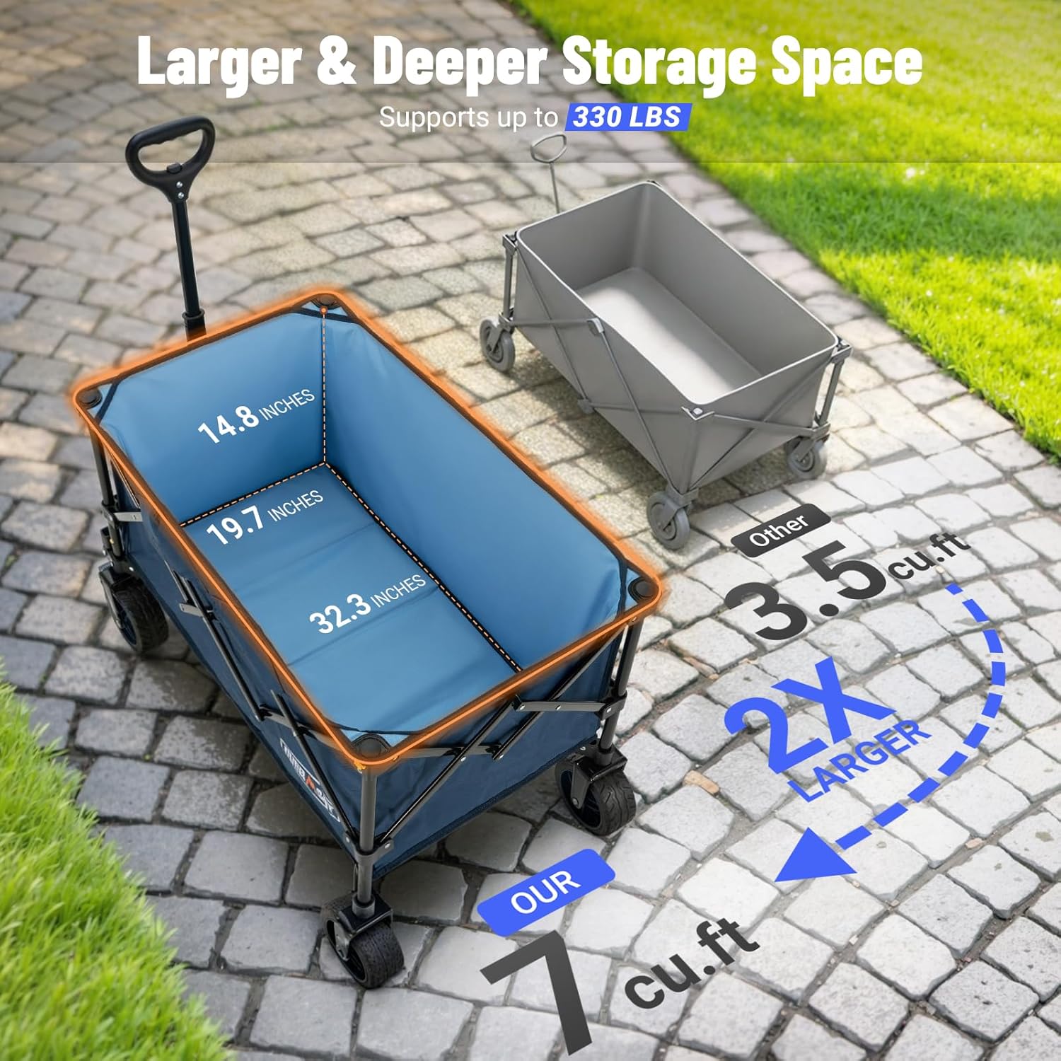 - ใ๐๐๐ซ๐ ๐๐ซ ๐๐๐ฉ๐๐๐ข๐ญ๐ฒ & ๐๐ฎ๐ซ๐๐๐ฅ๐ใ: Overmont heavy-duty wagon cart expands to a roomy L 32.3โ x W 19.7โ x H 23.3โ. Itโs ๐ ๐๐๐๐๐ larger than most other wagons. Crafted with ๐๐% thicker durable steel frame, it supports an impressive 330 lbs.