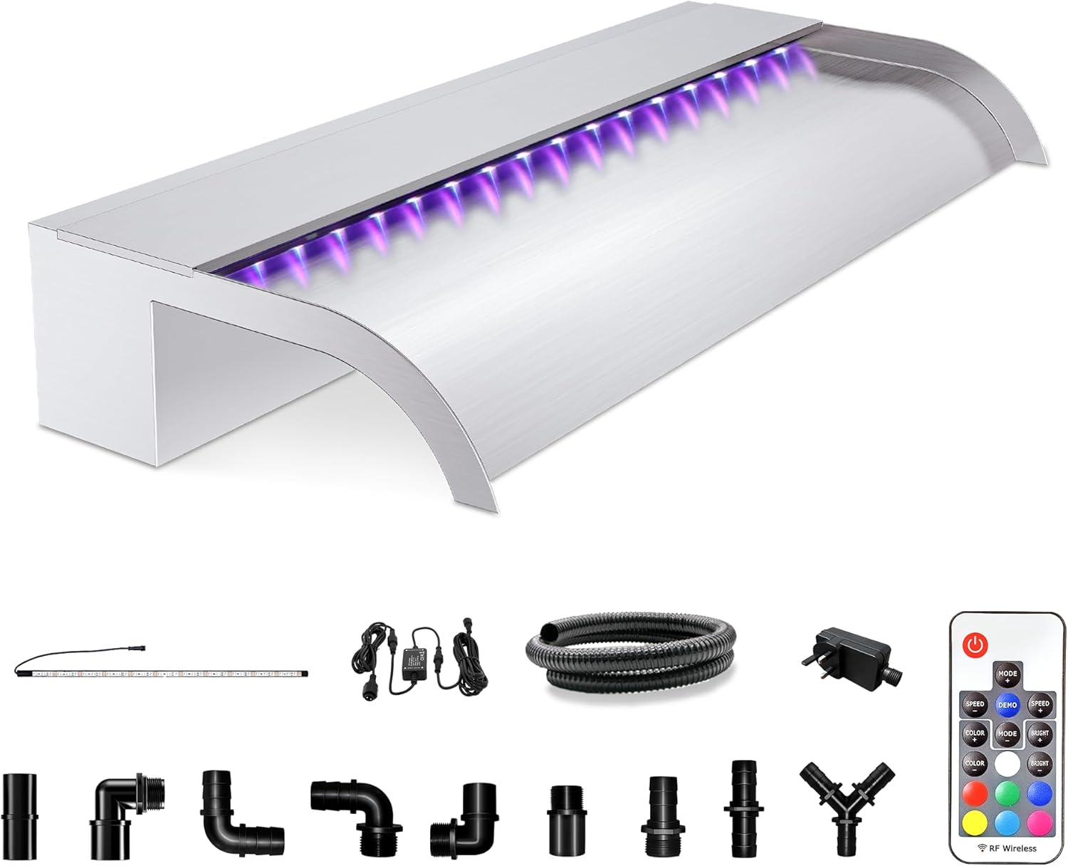 - ăStainless Steel Waterfallă The main body of the stainless steel waterfall spillway is welded together using 304 stainless steel, providing durability for long-term use, ensuring rust-proof and no water leakage. The open lip design creates an elegant, invigorating freefalling water effect for your swimming pool or pond
