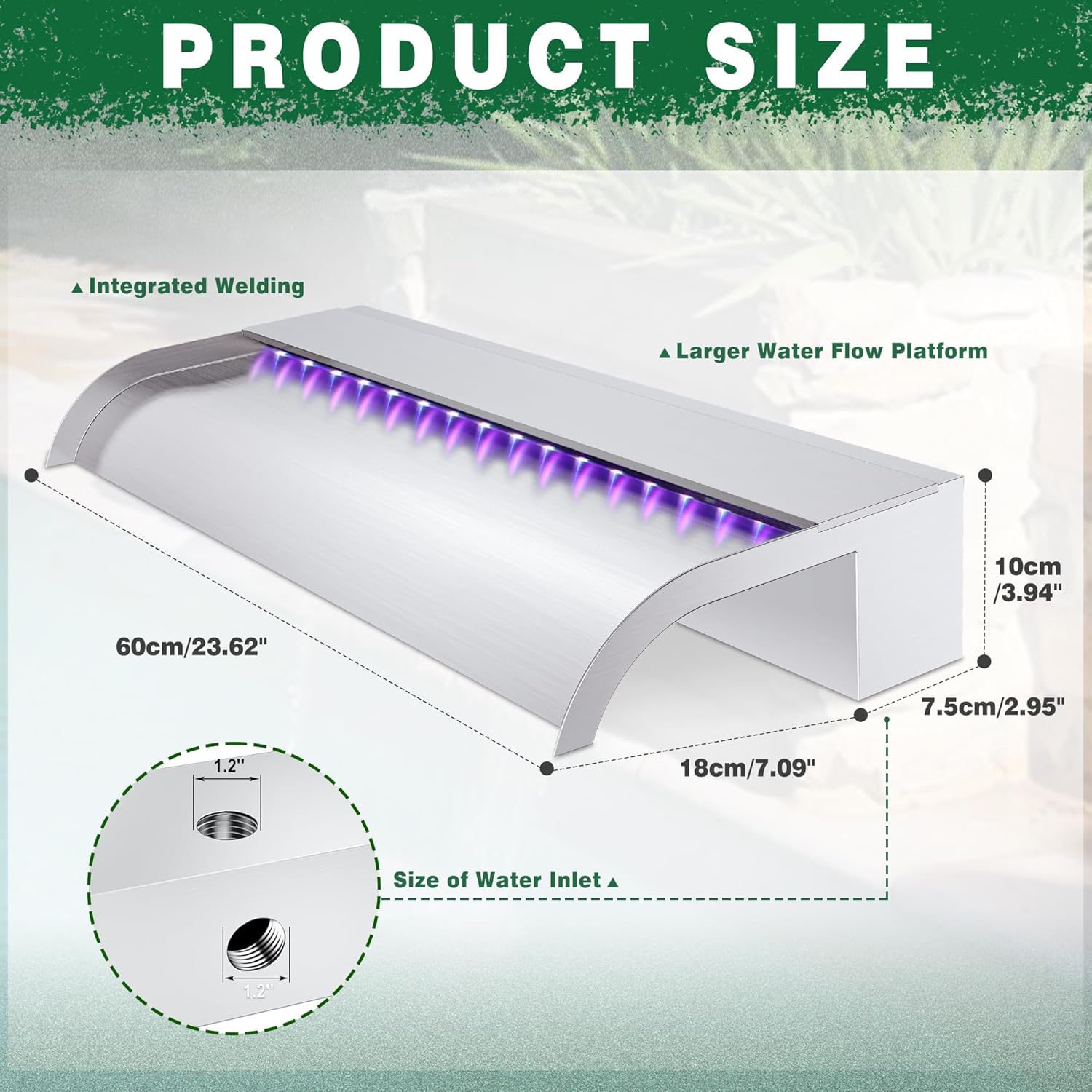 - ăWider Water Flow Platform & Curved Open Lip DesignăThe pool waterfall has an 8-inch wide integrated welding water platform, 3.94-inch high water storage tank platform, and 90-degree tilt angle. This design creates a stable, smooth, vertical waterfall for a stunning water display. The soothing sound and sight of the cascad
