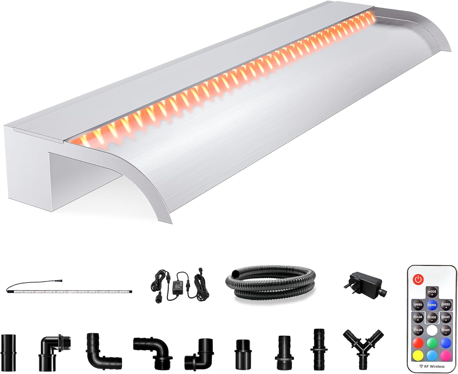 - ăStainless Steel Waterfallă The main body of the stainless steel waterfall spillway is welded together using 304 stainless steel, providing durability for long-term use, ensuring rust-proof and no water leakage. The open lip design creates an elegant, invigorating freefalling water effect for your swimming pool or pond