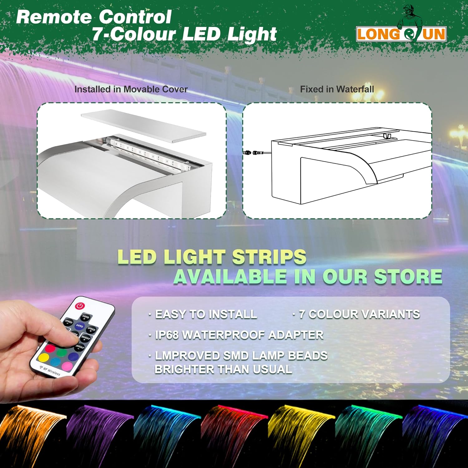- ăDIY Decoration Pool & Pond fountainăLONGRUN waterfall spillway will make a decorative addition to your garden patio pond or swimming pool, it makes them more elegant, fashionable and beautiful. The color change of LED lights and the gentle sound of water running make your patio more special at night