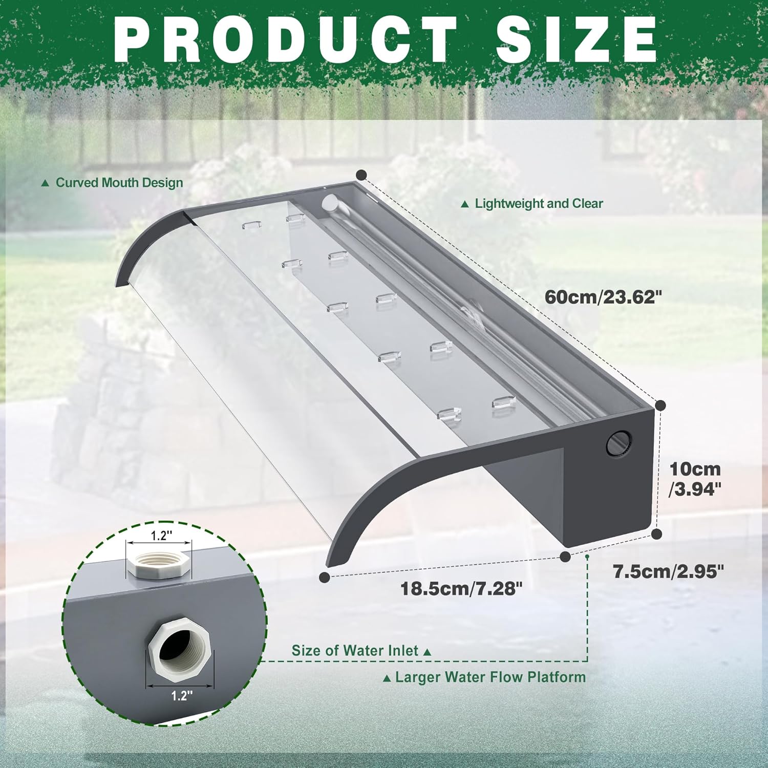 Pool Fountain, LONGRUN Waterfall Spillway for Koi Ponds - 23.6" Transparent Acrylic Waterfall Multi-Color LED Lights for Swimming Pool, Garden Pond, Patios, Spa Decoration