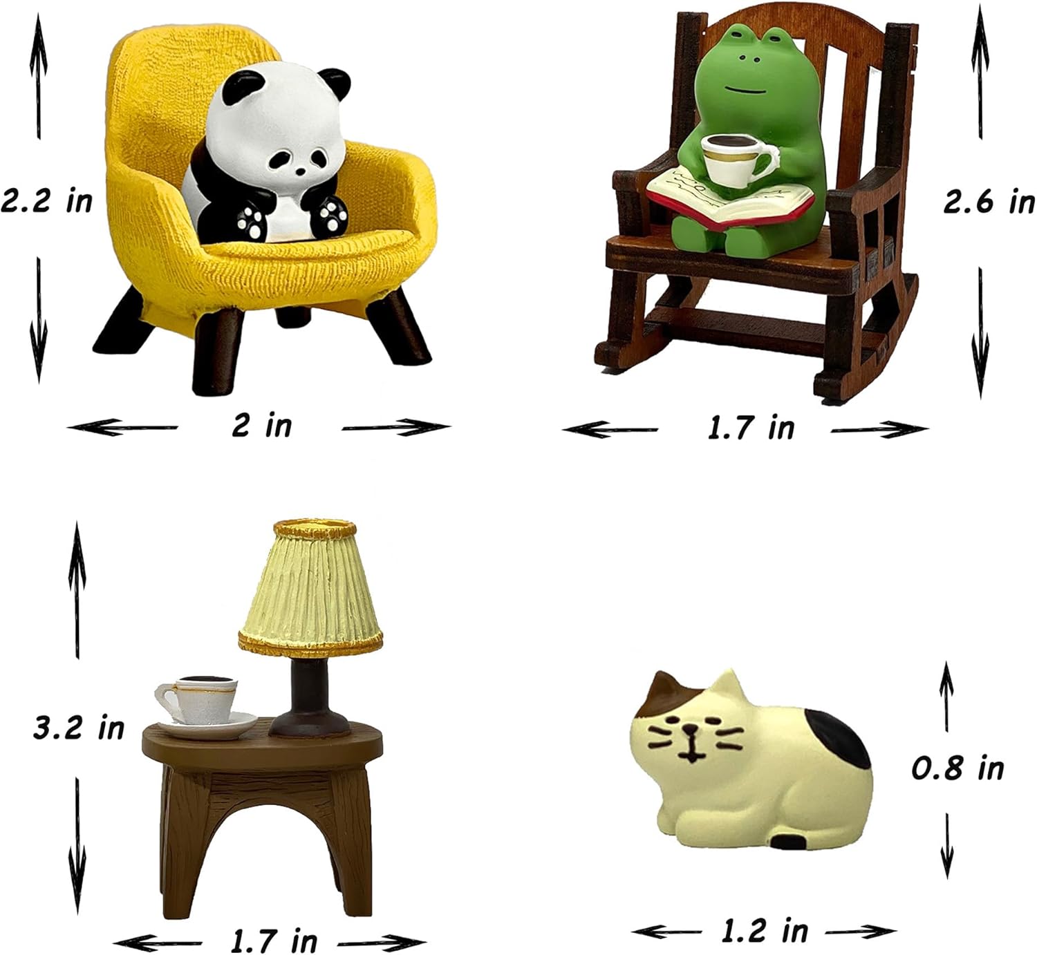 - Size and design: This set includes a frog sitting in a rocking chair enjoying coffee, a panda resting on the chair, and a desk with a table lamp and a cute cat statue. The design adds interest to your space and enhances your happiness