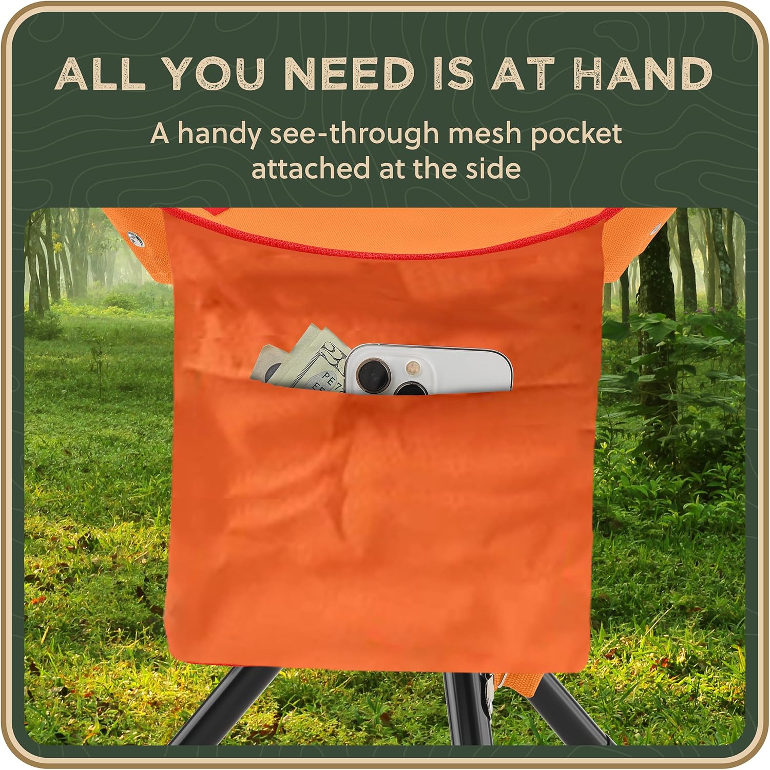 - ā HANDY MESH STORAGE: Featuring a breathable mesh pocket, the small hunting chair allows for easy access to your essentials like snacks, gadgets, or small tools, keeping them secure by the folding hunting chair without the bulk of larger pockets