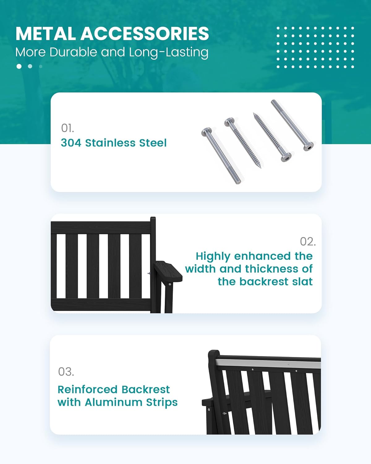 - High Weight Capacity: Tested to support up to 660 lbs, this outdoor bench is suitable for people of various body types and sizes. Its sturdy structure and premium materials ensure lasting performance.