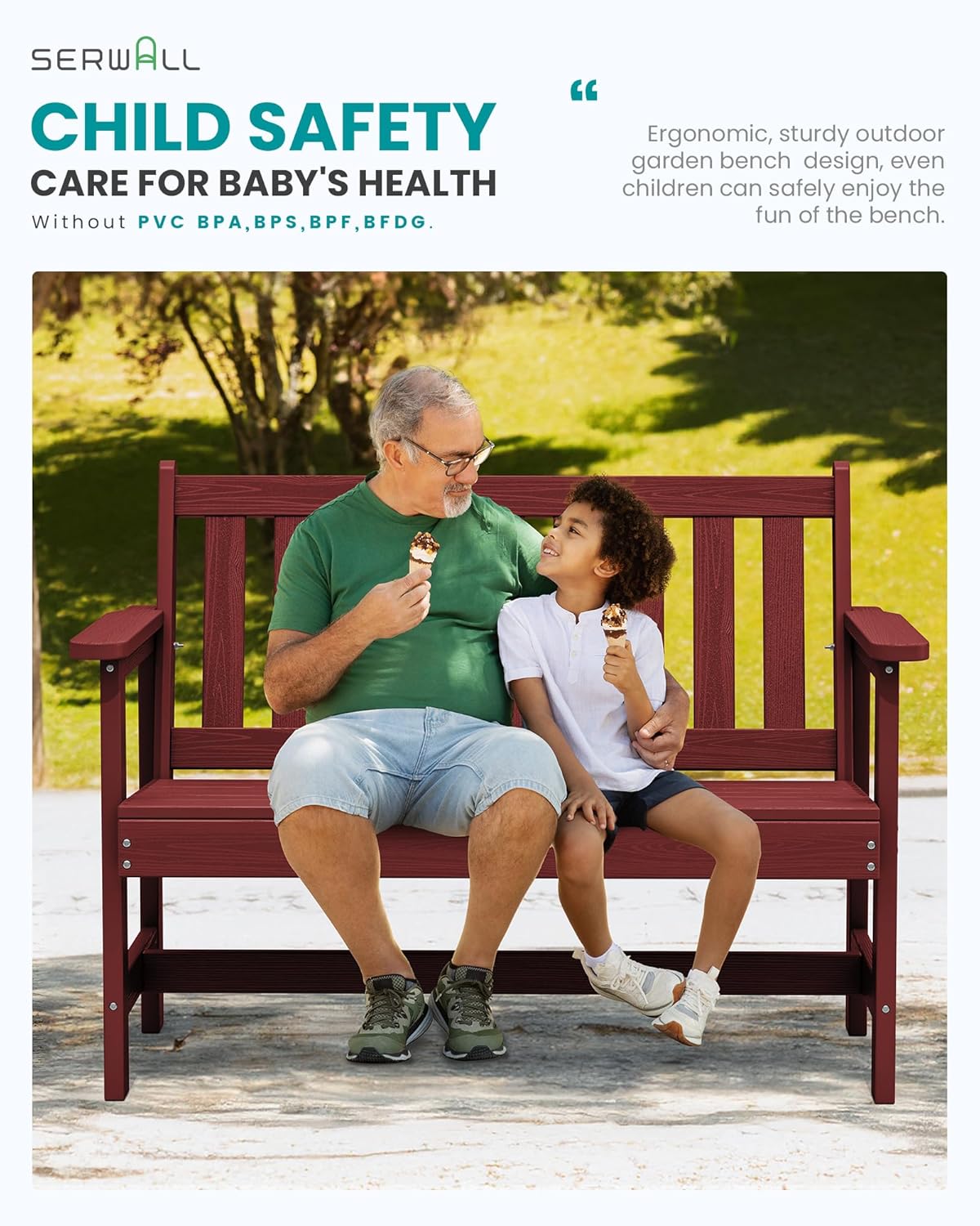 - All-Weather Resistant: The SERWALL garden bench is made of durable high-density polyethylene (HDPE), along with 304 stainless steel hardware, making it resistant to various weather conditions and ensuring long-lasting durability. It is an ideal choice for any outdoor environment.