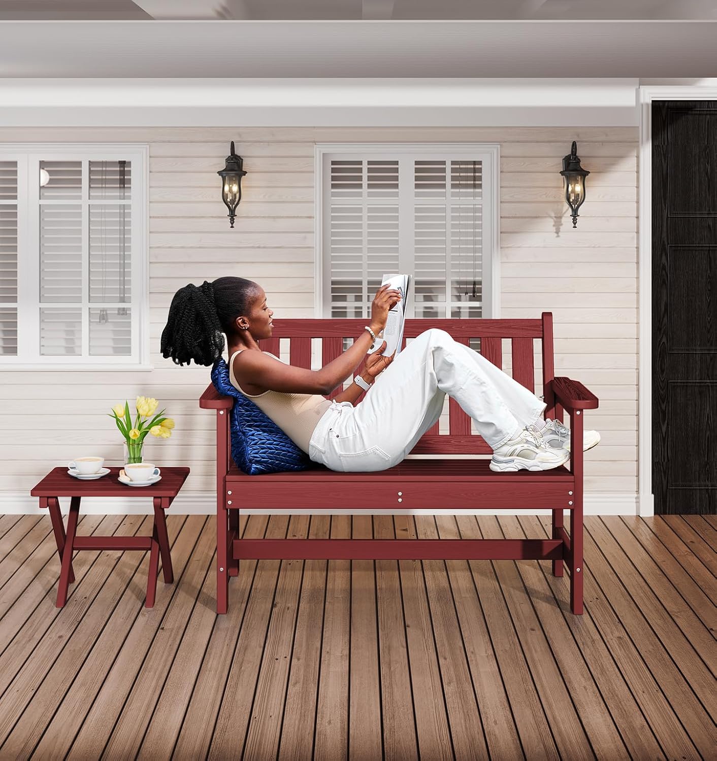 - Low Maintenance: The high-density polyethylene (HDPE) material of the porch bench requires minimal maintenance. Simply wipe with a cloth or rinse with water to keep it clean, ensuring the poly outdoor bench remains aesthetically pleasing for a long time.