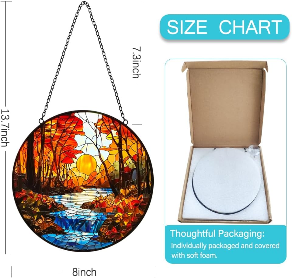 Fall Decor Sunset Suncatcher Stained Glass Window Hanging - Handmade Sun Catchers Indoor Window Decor with Tree and River - Stain Glass Christmas Decorations Panels - Birthday Gift for Women Men Mom
