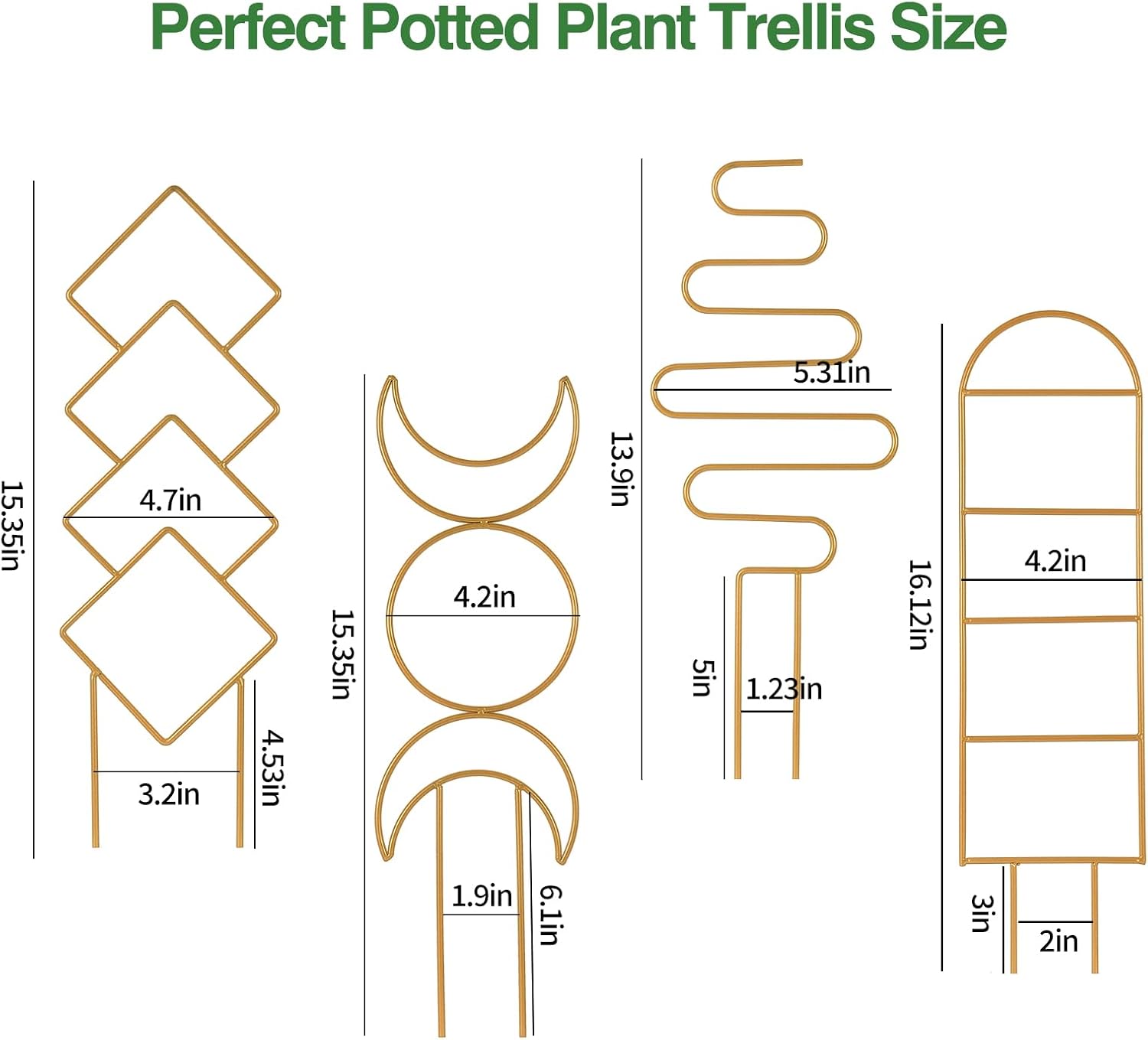 - Lattice for Climbing Plants: These 4 trellis for potted plants are between 15nch and 16inch in height. The metal trellis has a certain weighing capacity, and the perfect potting height can support small vines, allowing potted plants to grow upwards and help them get more sunlight to prevent sagging. The whole set of house plant trellis design can also better highlight your house plants and potted plants, and add style to your home potted plants.