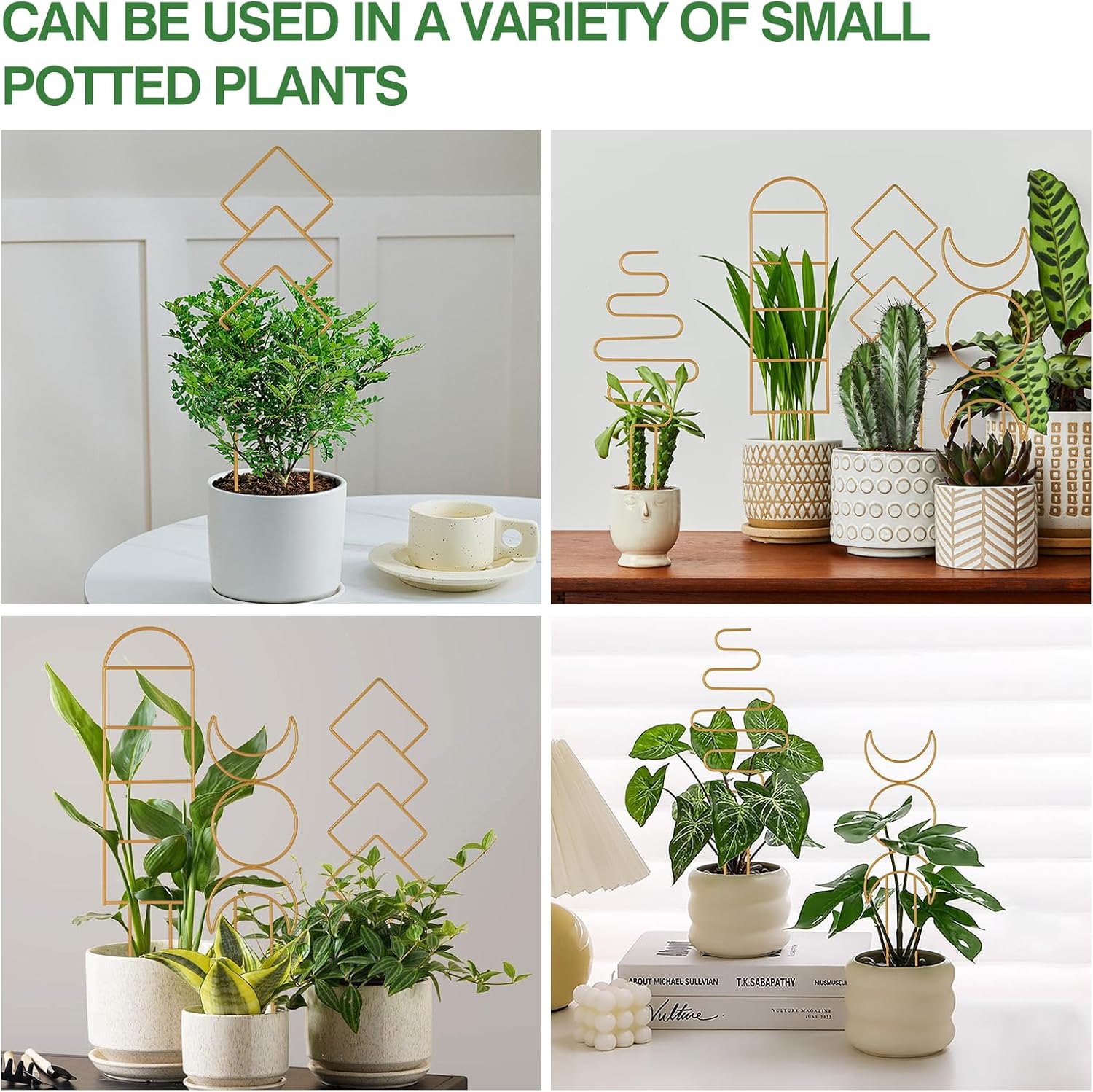 - Plant Supports Set: 4 packs uniquely designed mini trellis(different patterns), meet your multiple potted needs and provide the structure your indoor climbing plants need to develop. Let your vine potted plants become the decorations of your home.