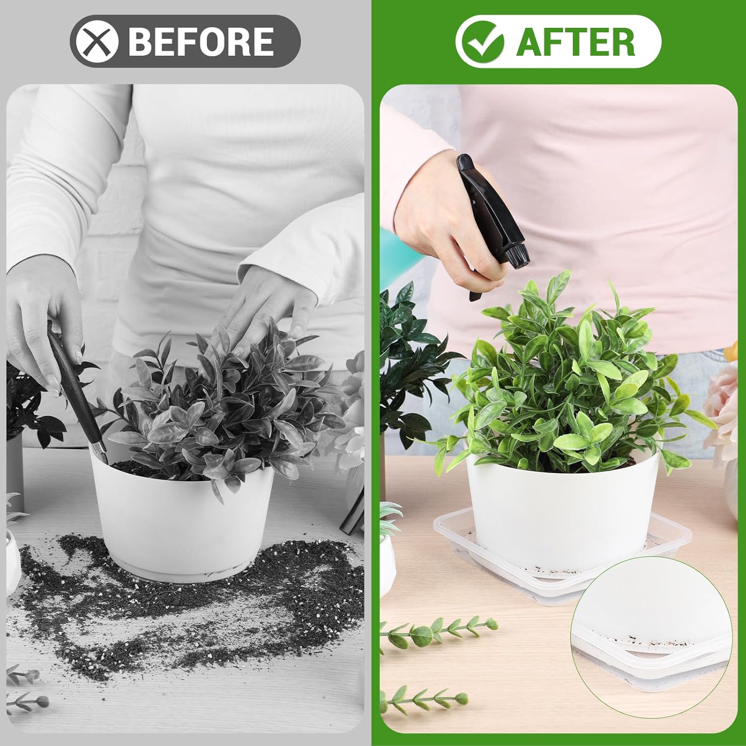 - Floor Protection Design: These watering trays act as a protective barrier, collecting excess water and soil overflow, preventing damage to your floors and furniture while keeping your living space tidy. Use these plant trays to enhance both the style and functionality of your home.