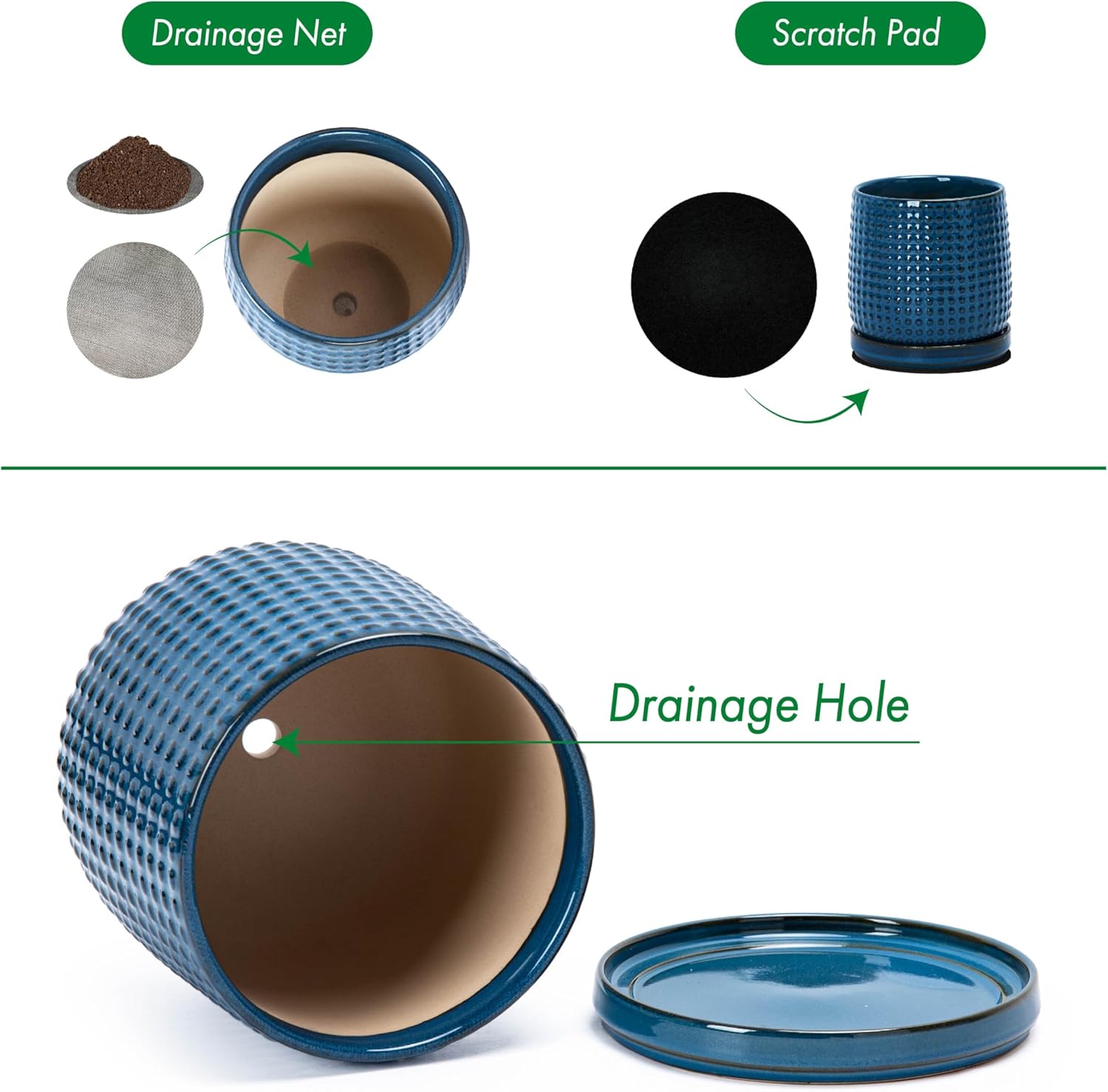 D'vine Dev Set of 2 Ceramic Plants Pots, 4 Inch Beaded Stoneware Flower Pot for Plants with Drainage Hole and Saucer, Midnight Blue, 27-E-Z-3