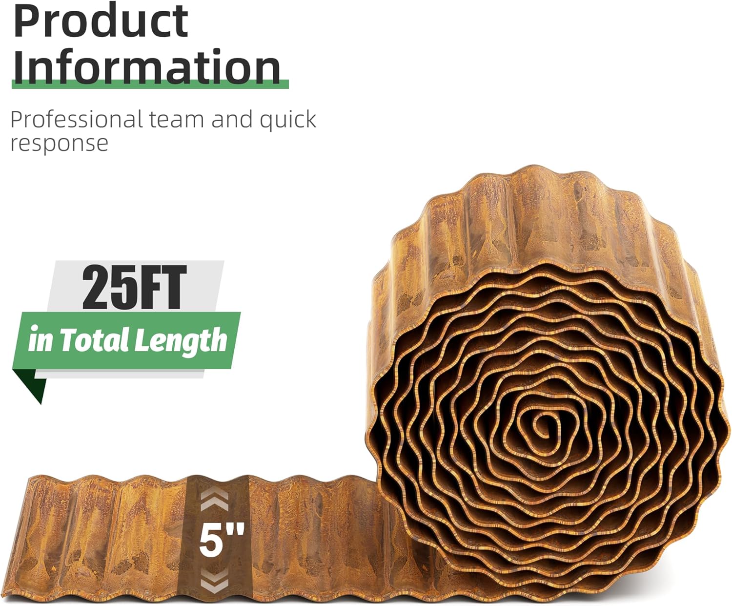 Corrugated Metal Garden Edging, 5''×25Ft Steel Landscape Edging Border, Flower Bed Edging Borders, Metal Lawn Edging for Landscaping, Garden, Pathway, Lawn, Flower Bed, Garden Fence (Rusty)
