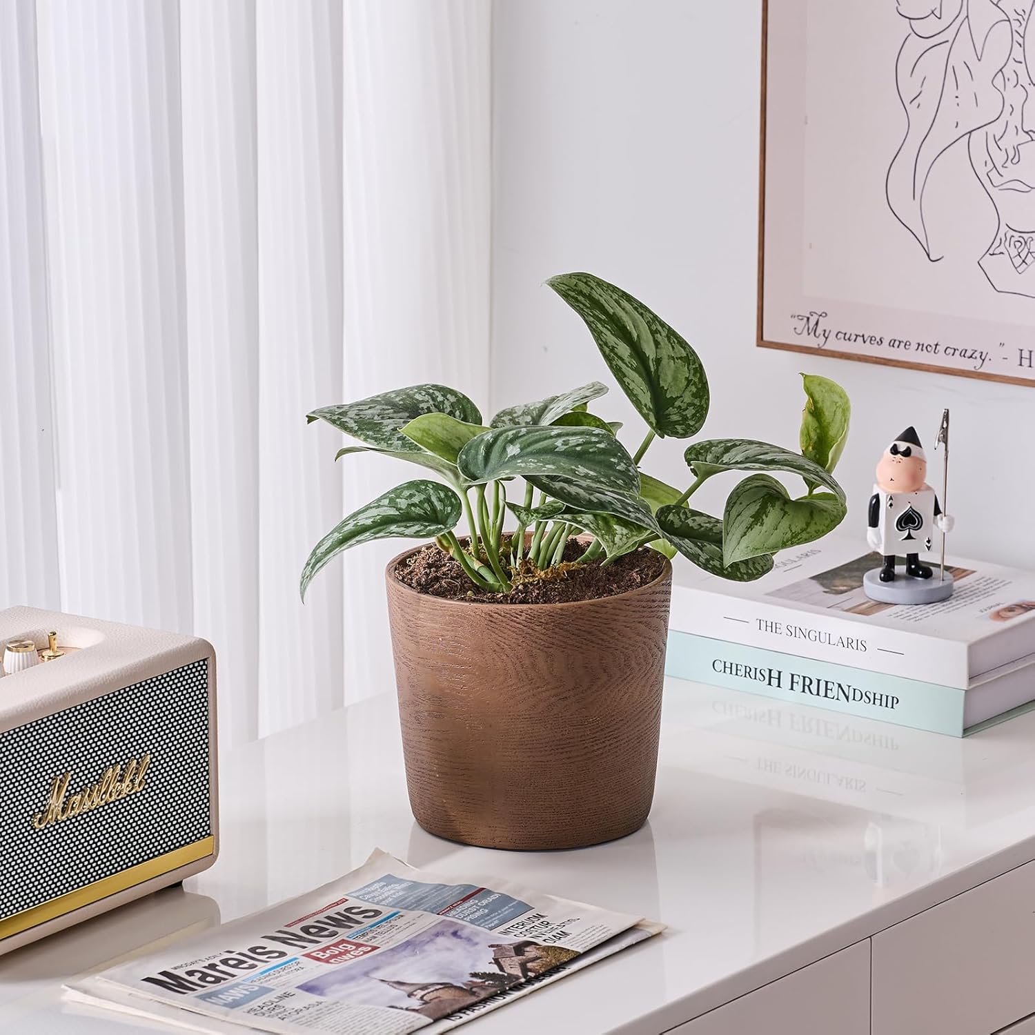Ekirlin 7 inch Plant Pot, Resin Mahogany Texture Flower Planters with Drain Hole, Removable Rubber Stopper and Non-Slip Soft Pad - for Most Plants and Flowers