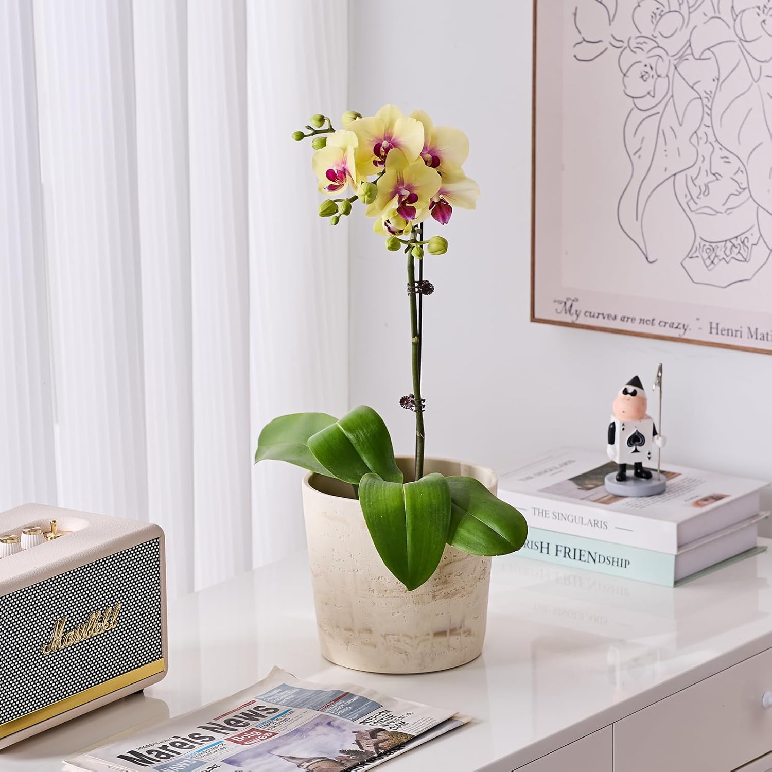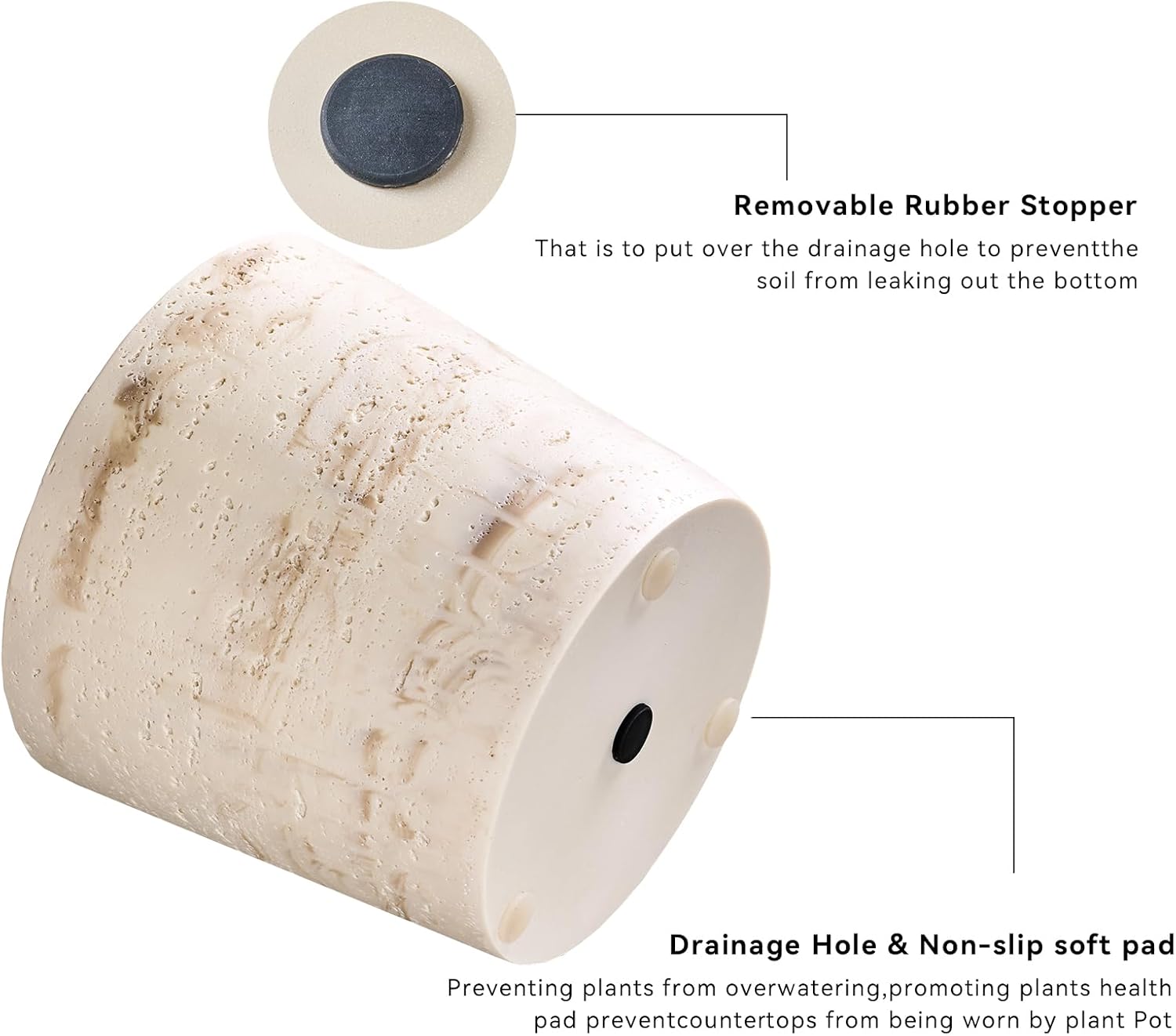 Ekirlin 7 Inch Natural Travertine Textures Plant Pot, Resin Outdoor Planter with Drainage Hole, Removable Rubber Stopper and Non-Slip Soft Pad,Weatherproof Decorative Pot for Indoor/Garden Plants