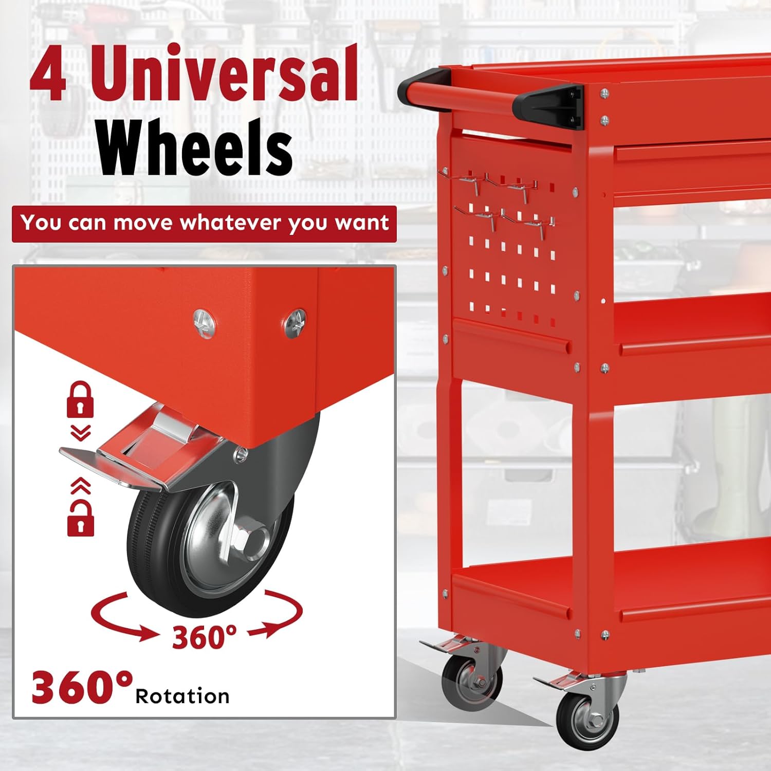 - Efficient Tool Organization: This rolling tool cart offers ample storage space with 3 trays,a lockable drawer, a tool panel. It’s hooks and plugs for small parts, allowing easy access to frequently used tools and enhancing your workflow efficiency.