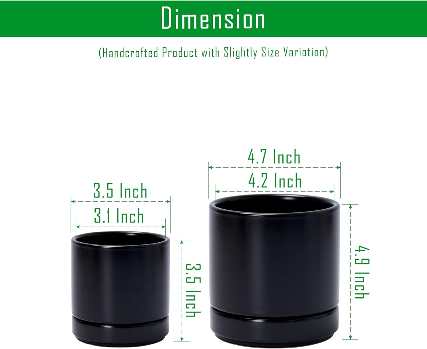 D'vine Dev 3.5 Inch & 4.7 Inch Ceramic Planter Pots for Plants with Drainage Hole and Saucer, X-Small Plant Pots Set, Black, 94-G-XS-2