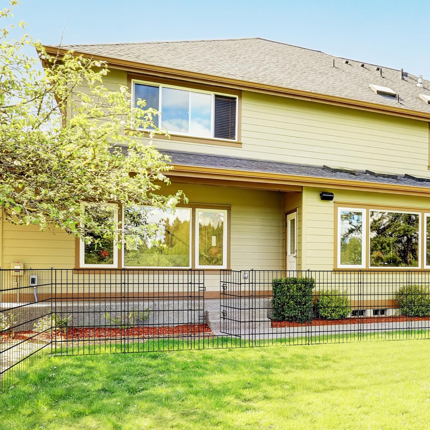 - 【Size】 Each panel of the outdoor dog fence measures 28" H x 32" W, 4 panels, 1 gate, and provides flexibility to create different shapes and sizes to suit your specific yard requirements. Their sturdy frame provides extra strength and durability. Made of high-quality rustproof metal material and coated with a durable finish, this metal fence is resistant to rust, corrosion, and weather, and can withstand years of outdoor use.