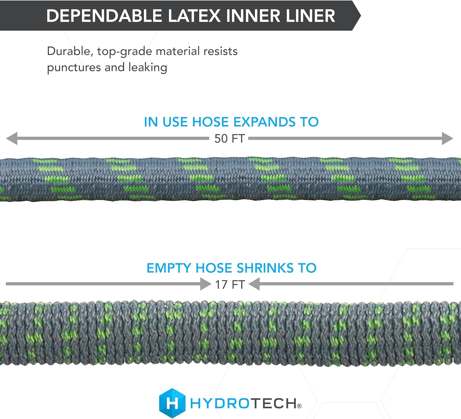 - EXPANDABLE – The HydroTech 50ft Expandable Garden Hose is the only garden hose you’ll need. It is lightweight and durable, and shrinks to 17ft when empty, making it ideal to transport anywhere you work.