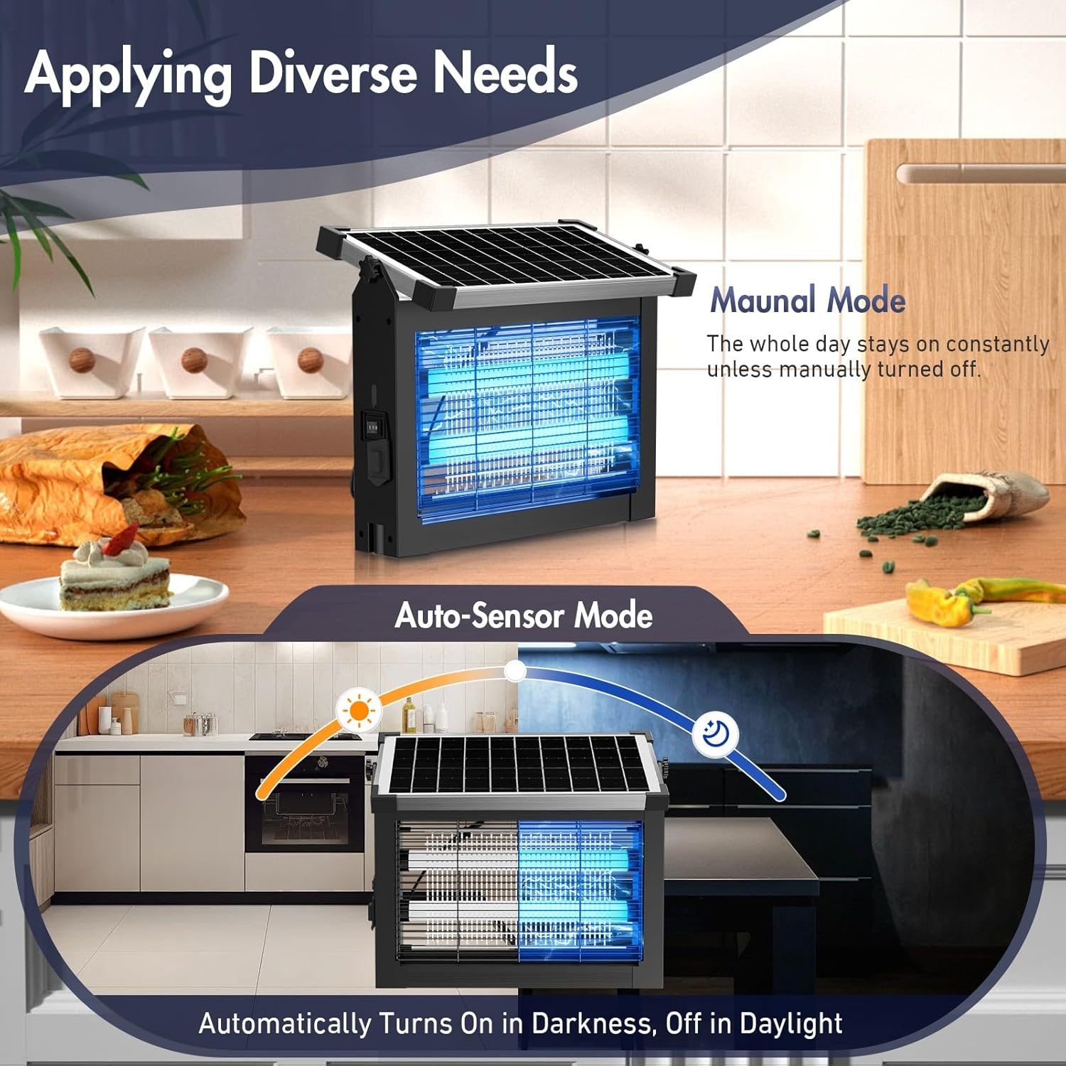 - Smart Dual-Mode Operation – Manual Mode allows the mosquito killer to deliver 24/7 intelligent protection, ensuring mosquitoes are solved whenever needed. In Auto Mode, the mosquito zapper outdoor auto sleeps during solar charging and auto-on when charging ceases - Increasing energy-saving efficiency by 40%.