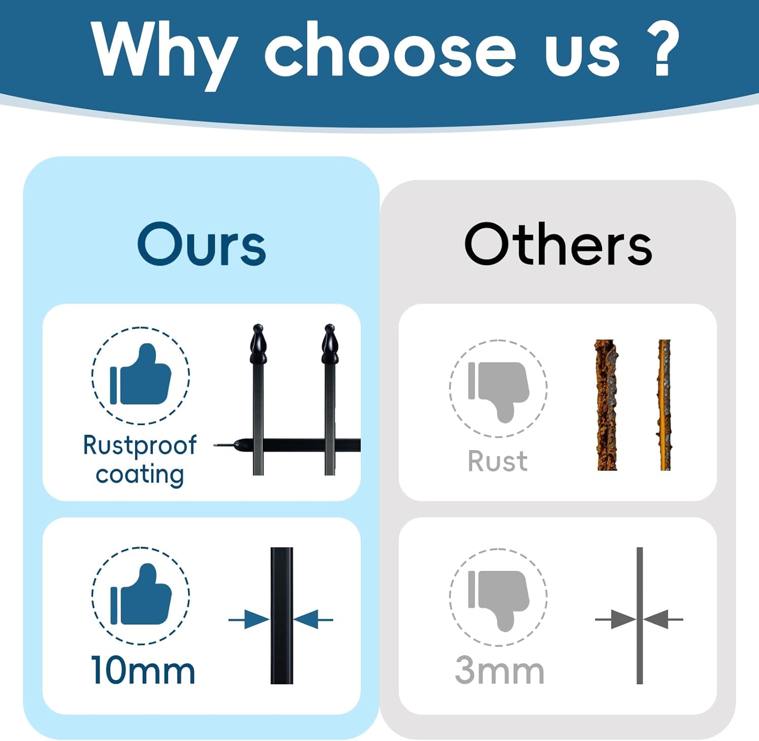 - 【Sturdy and Durable】This metal garden fence is made of 10mm diameter wrought iron welded together and covered with a white rust-resistant coating that won't rust easily. Compared to wood fences and plastic fences, it requires no frequent maintenance, is fearless of insect bites and corrosion, effectively withstands harsh weather, and is durable.