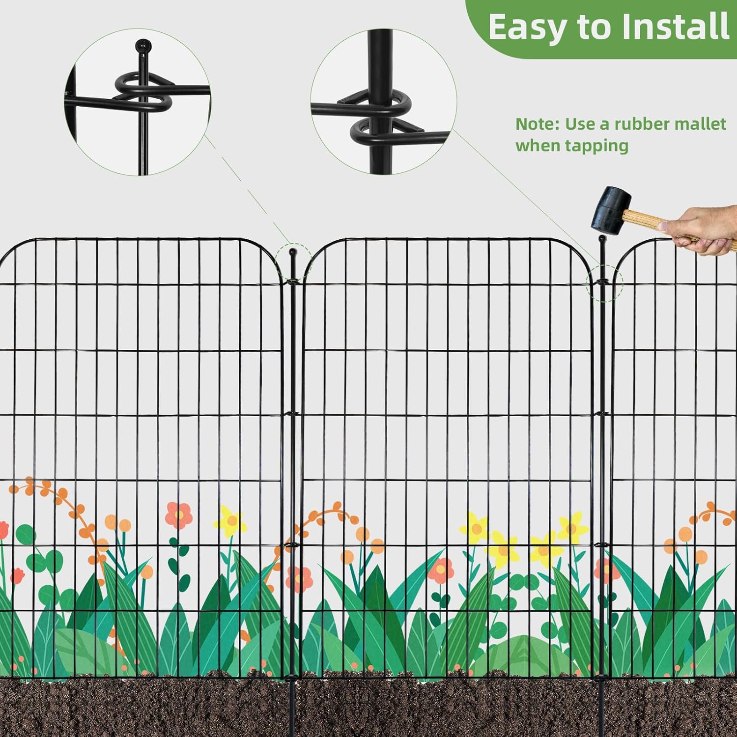 - 【 Easier to Assemble】No need snaps or ties. Simply align the holes in the center of the two fence panels and insert them into the soil with metal stakes. Conical metal stakes at the bottom make installation easier and less labor-intensive. Not easy to damage the fence panels, such as breakage and deformation. Rubber hammer strikes the top of the metal stake. Done!