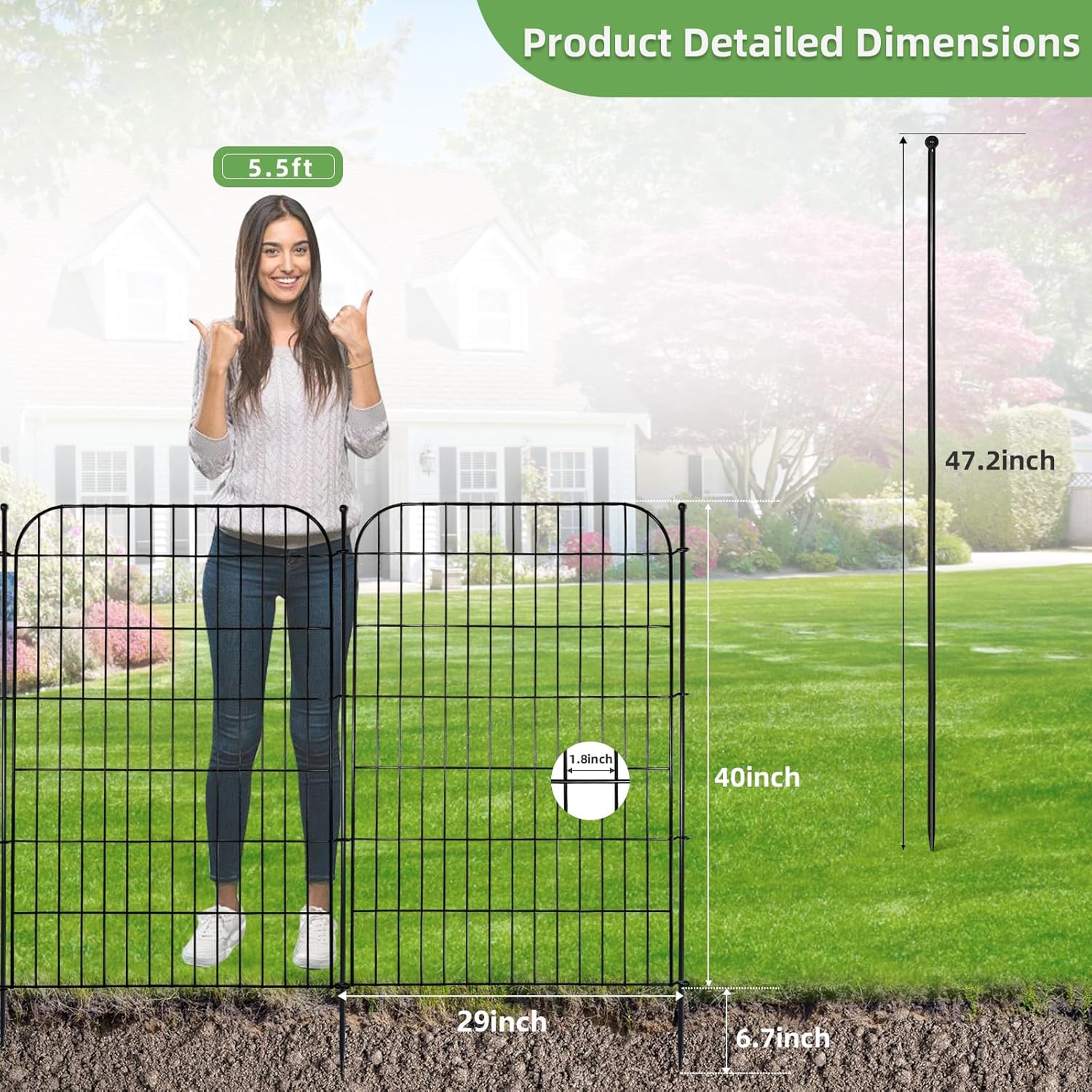 - 【Detailed Dimensions】Transform your garden with the Blingluck tall garden fence! This set includes 5 fence panels (40" H x 29" W), 6 sturdy metal stakes (47.2" H). With a total height of 47.2" (including 7" stakes in the ground), a 1.8" fence gap, and an overall length of 11.8 ft. Keep your garden stylish and secure!