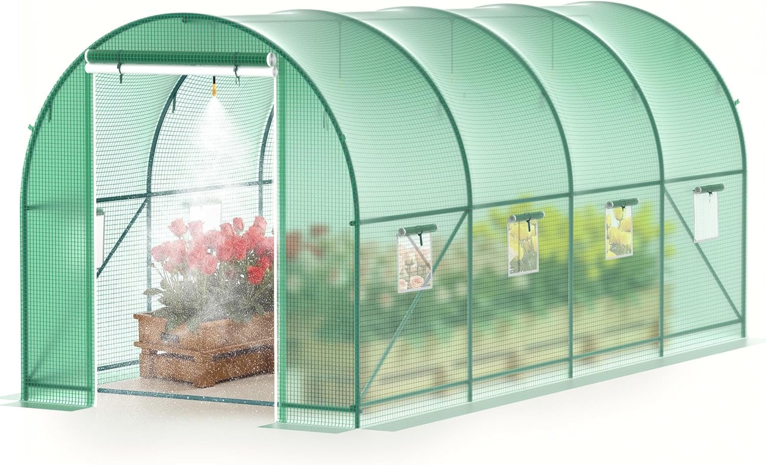 15x7x7 FT Walk-in Greenhouse for Outdoors w/ Watering System,8-Ventilated Screen Window Portable Greenhouse for Winter Plant Protection w/ 2-Zipper Door,PE Cover & Heavy Duty Frame