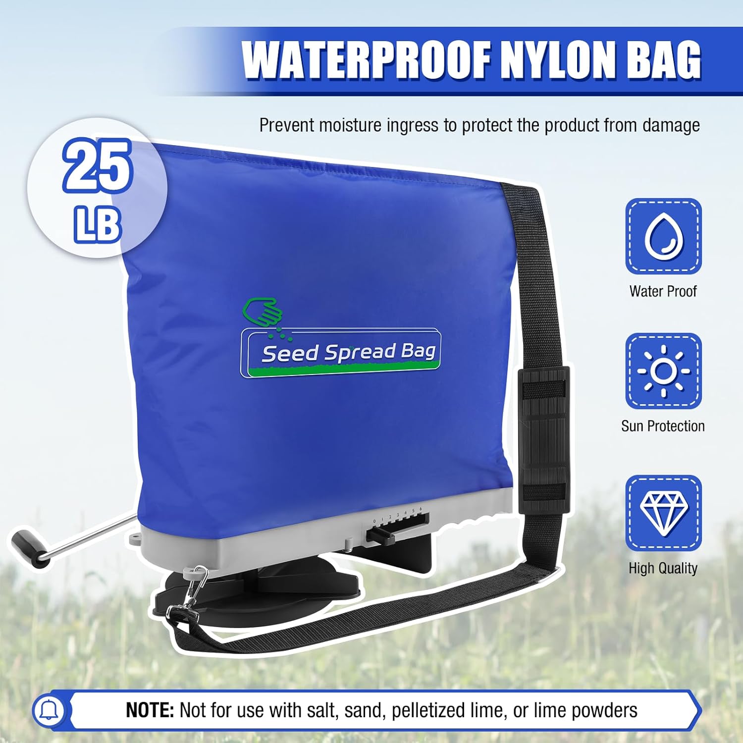 Zipcase 25lb Bag Seed Spreader with Waterproof Bag, Rare Baffle and Accurate Gears, Handheld Grass Seed Spreaders for Lawns, Blue