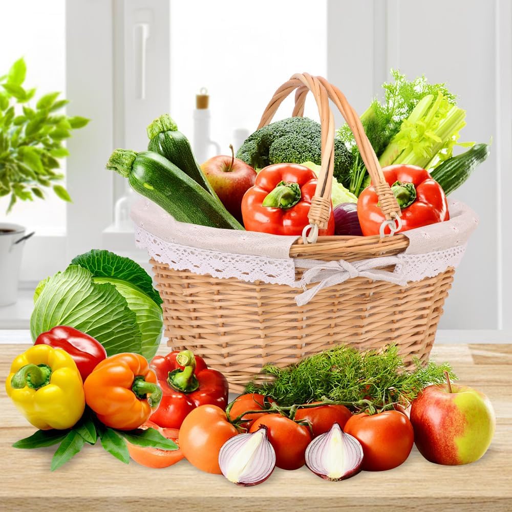 2 Pack Natural Wicker Basket with Linen Lining, 14 & 12 Inch Wicker Woven Picnic Basket with Handle for Picnic, Camping, Outdoor Party