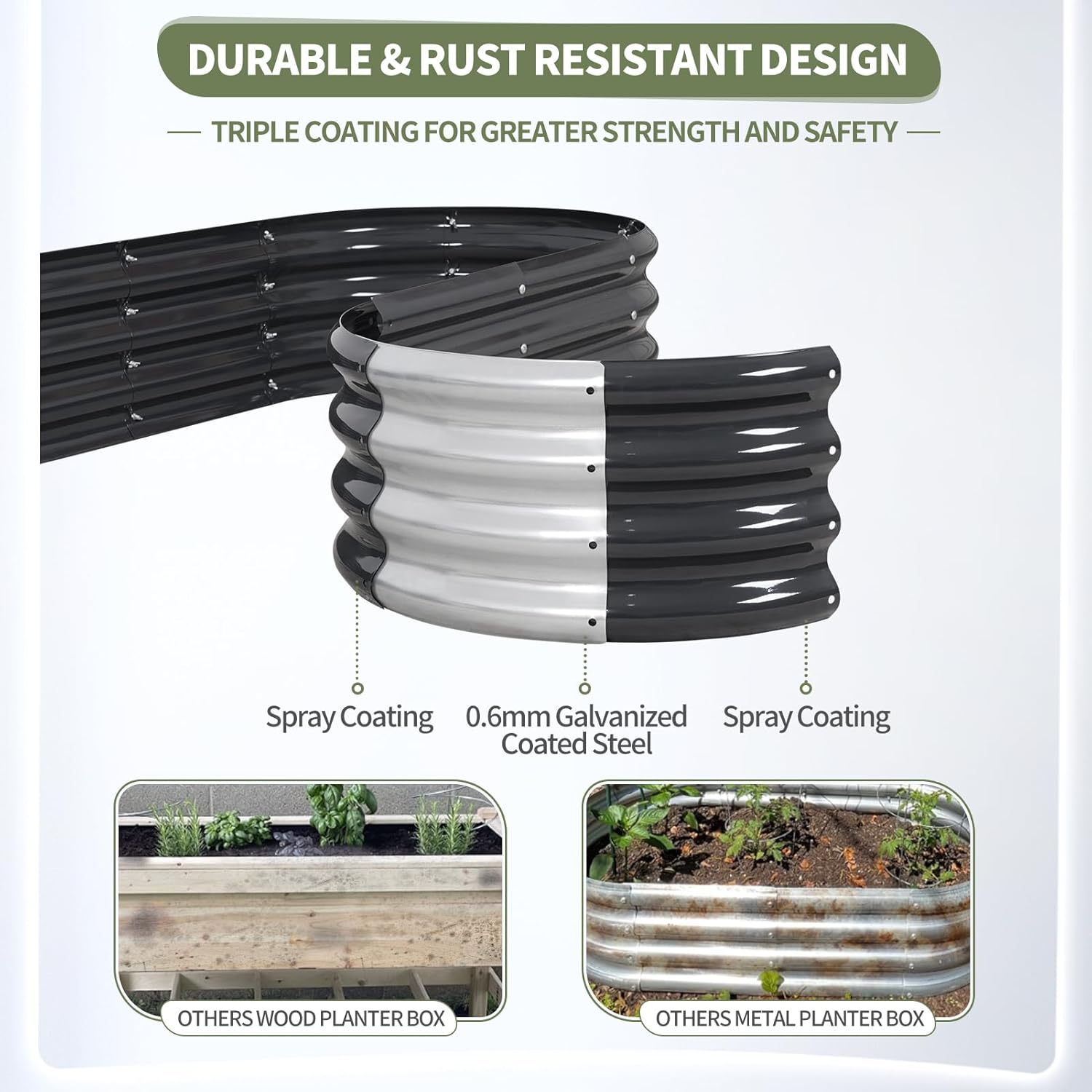 - 【Upgrade Quality & Structure 】The raised garden bed is made of thick galvanized metal with a surface spray coating, which is rust proof and anti-corrosion. Can be used for a long time. The oval design ensures uniform surface force and prevents deformation. More durable than other raised planter box, becoming a good helper for your garden