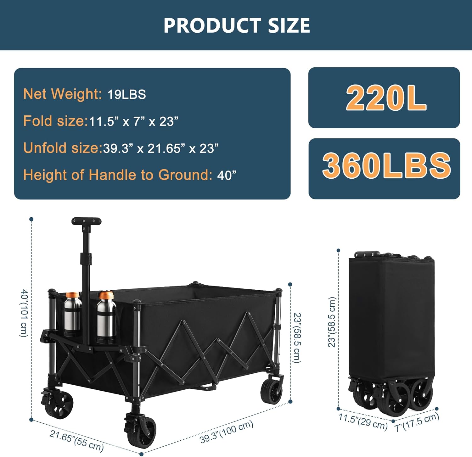- Sturdy & 360LBS Load Capacity - Constructed with a high-quality alloy steel frame that is 20% thicker than standard wagons, the innovative structural design of our cart enables it to carry a static load capacity of up to 360 pounds with great ease. The double-layer 600D Oxford fabric with PVC coating is not only waterproof and tear-resistant but also highly durable, ensuring long-lasting performance even in rugged conditions.