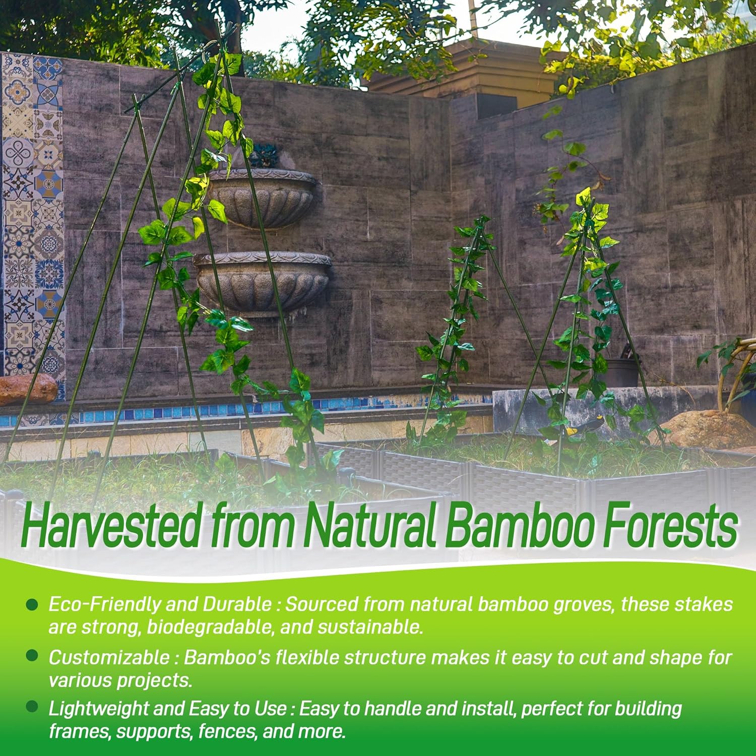 - Eco-Friendly & Durable: Made from high-quality, natural bamboo plant stakes with a green plastic protective film, our stakes are durable and weather-resistant. Fumigated for long-lasting use, the green film adds extra protection against wear, ensuring they last for multiple seasons.